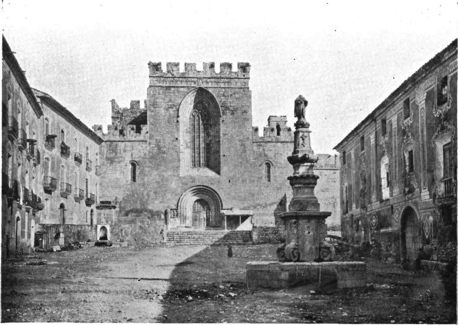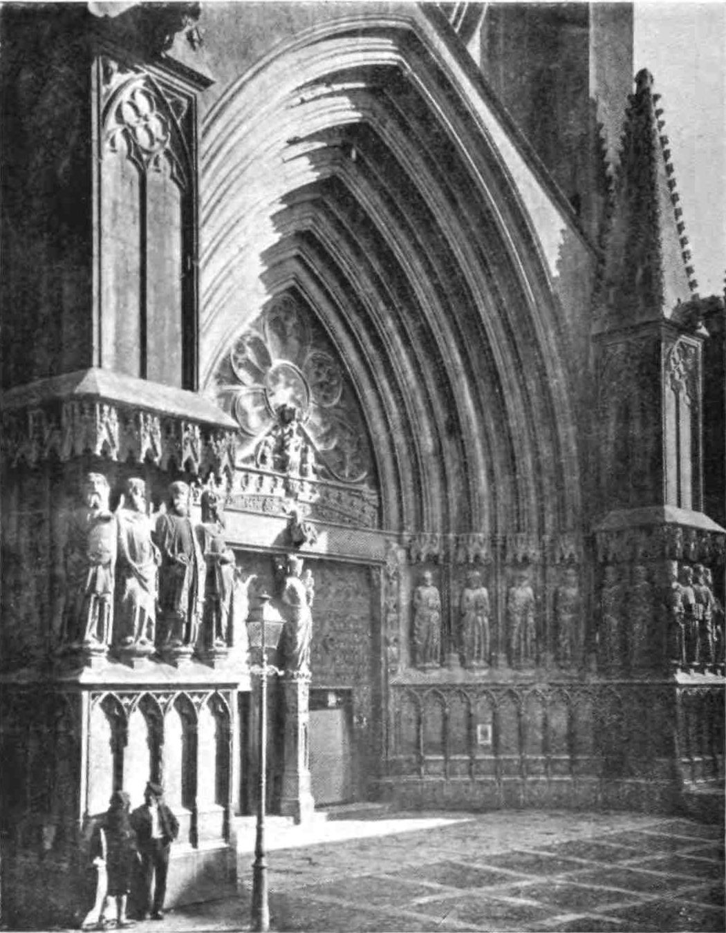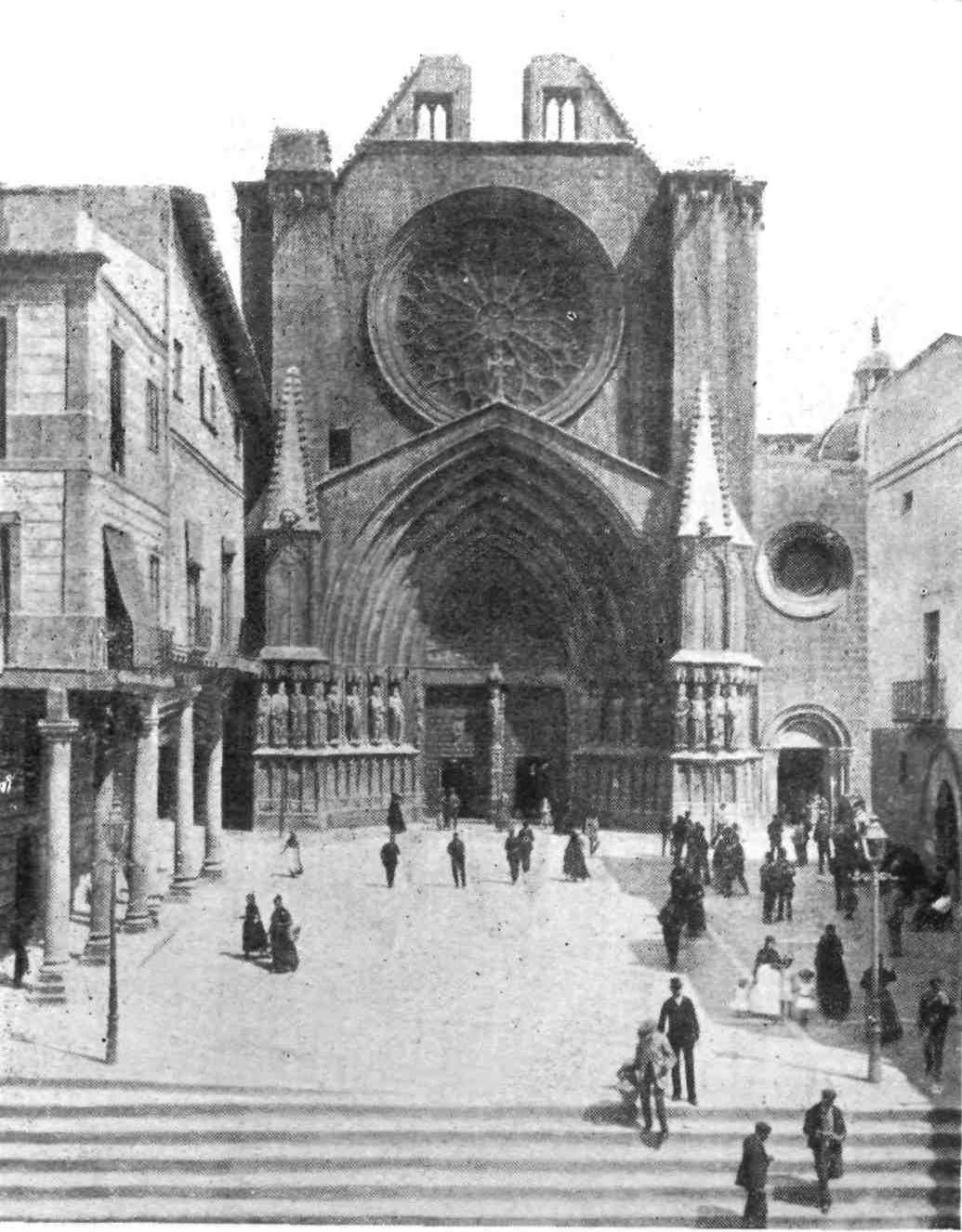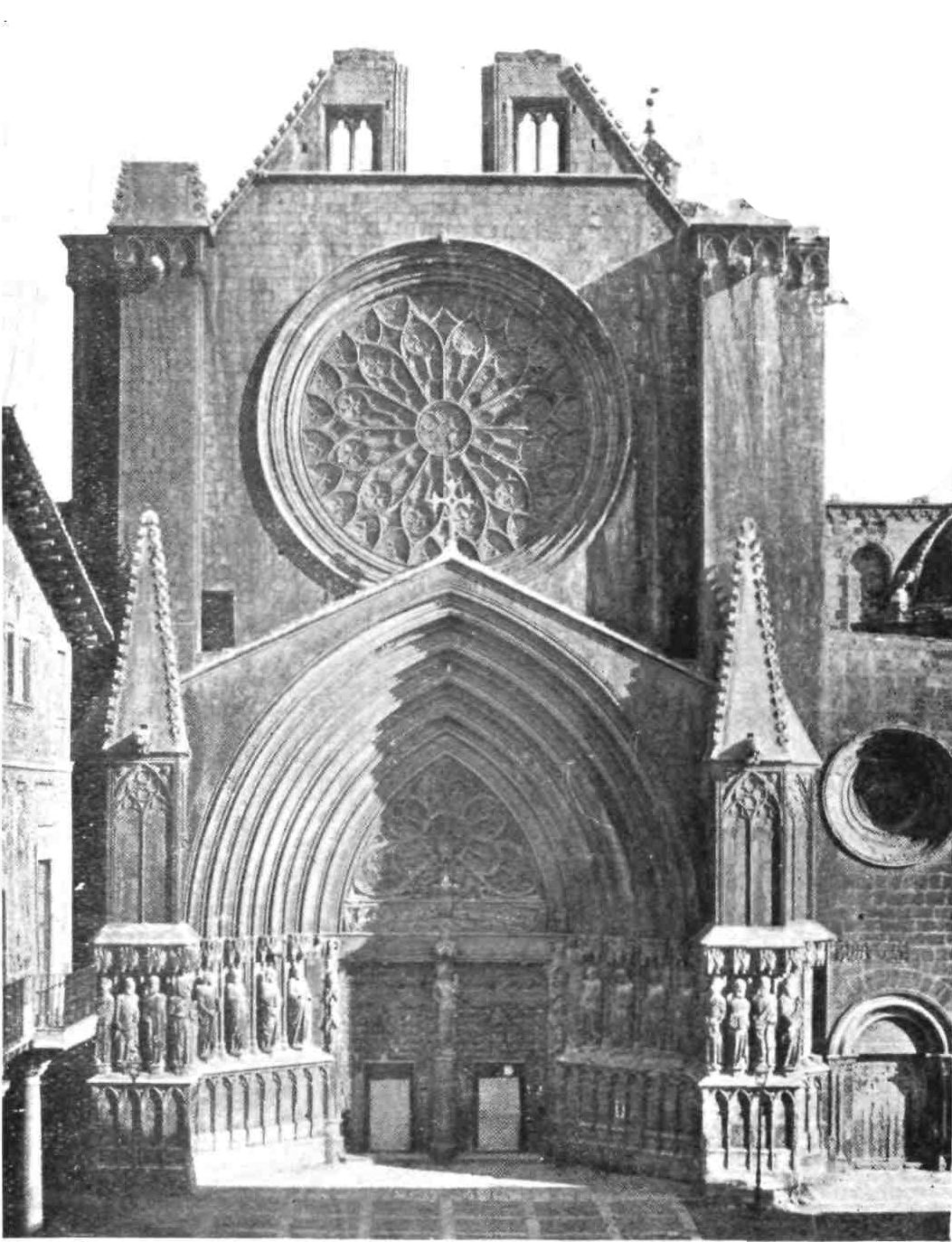 The transept doors are also very fine, especially the southern one. The cornice is beautifully sculptured and the wheel window above reveals in its details the influence of the Italian Romanesque. These entrances make us regret the effacement of the west porch, which is concealed by the vast square cloister covering that side of the church. This remarkable building, now occupied by troops, is the grandest, Street declared, he had ever seen. In its present desecrated state, it must be confessed it needs a highly trained eye to appreciate its beauty. The arcades are walled up, and there is some ground for supposing that when in ecclesiastical occupation the galleries were used as dormitory and refectory. The details vary greatly. The bays vary in width, the sculpture is of all sorts of design, and of all periods. Adjoining this vast cloister on the north side is a long barrel-vaulted hall, lighted only at one end. On{45} the west side the cloister is entered through an enormous western doorway with a pointed arch. South of this and almost detached from the cloister stands that beautiful octagonal steeple which served Pedro Balaguer as a model for the Micalet Tower at Valencia. It is 170 feet high and divided into five stages, “the whole construction being of the most dignified and solid description.”