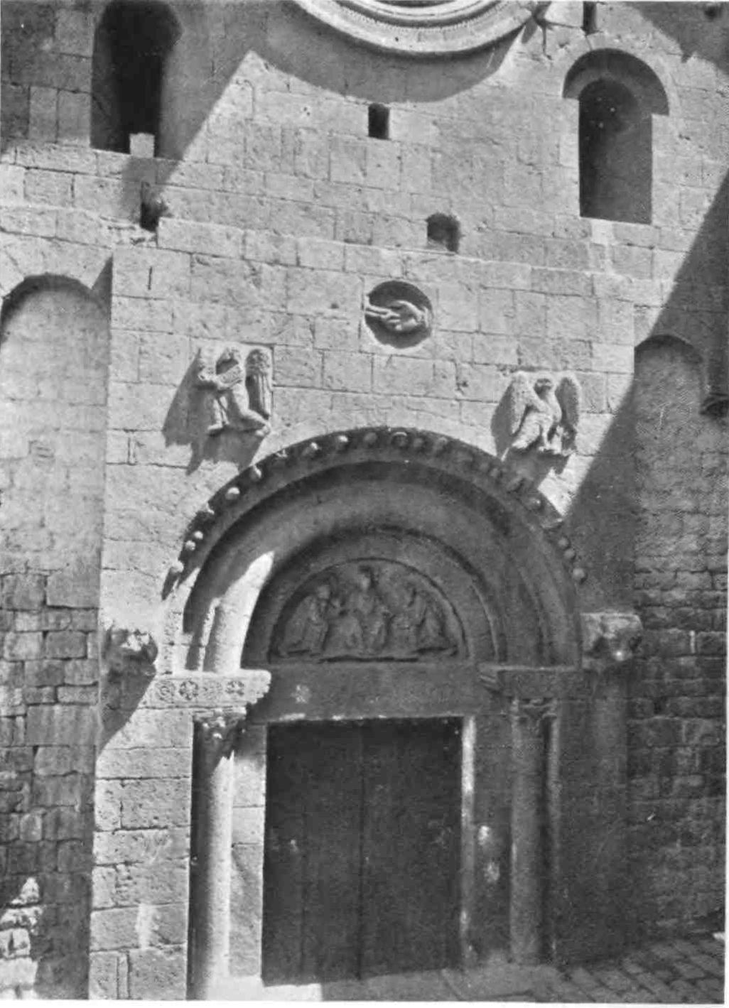 The façade on either side of this portal is similarly decorated with graphic reliefs in six courses, the lowest representing scenes in which{38} centaurs, lions, &c., figure; above this is a row of figures of knights, princes, and prelates; above this, battle scenes, then come two rows of sacred figures and subjects, and finally the figure of God the Father attended by angels and princes. The whole of this portal is of profound interest to students of the Romanesque.