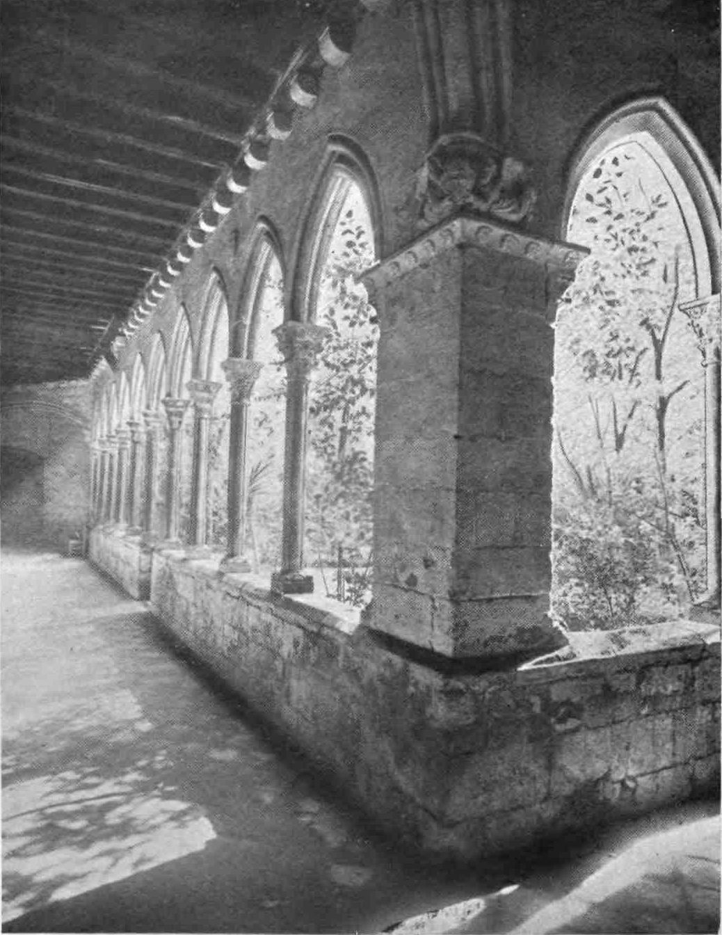 The cloister of the monastery is the most interesting part. It is composed of an upper and lower gallery of round arches, uninterrupted by any piers or buttresses. The harmony of the whole is admirable. The columns are of Gerona marble, and pinkish grey in hue. Variety is imparted by the capitals whereon the unknown sculptor has expended his fanciful, nervous genius. The upper gallery was not completed till the end of the fourteenth century, though the cloister had been begun as far back as 1172.
