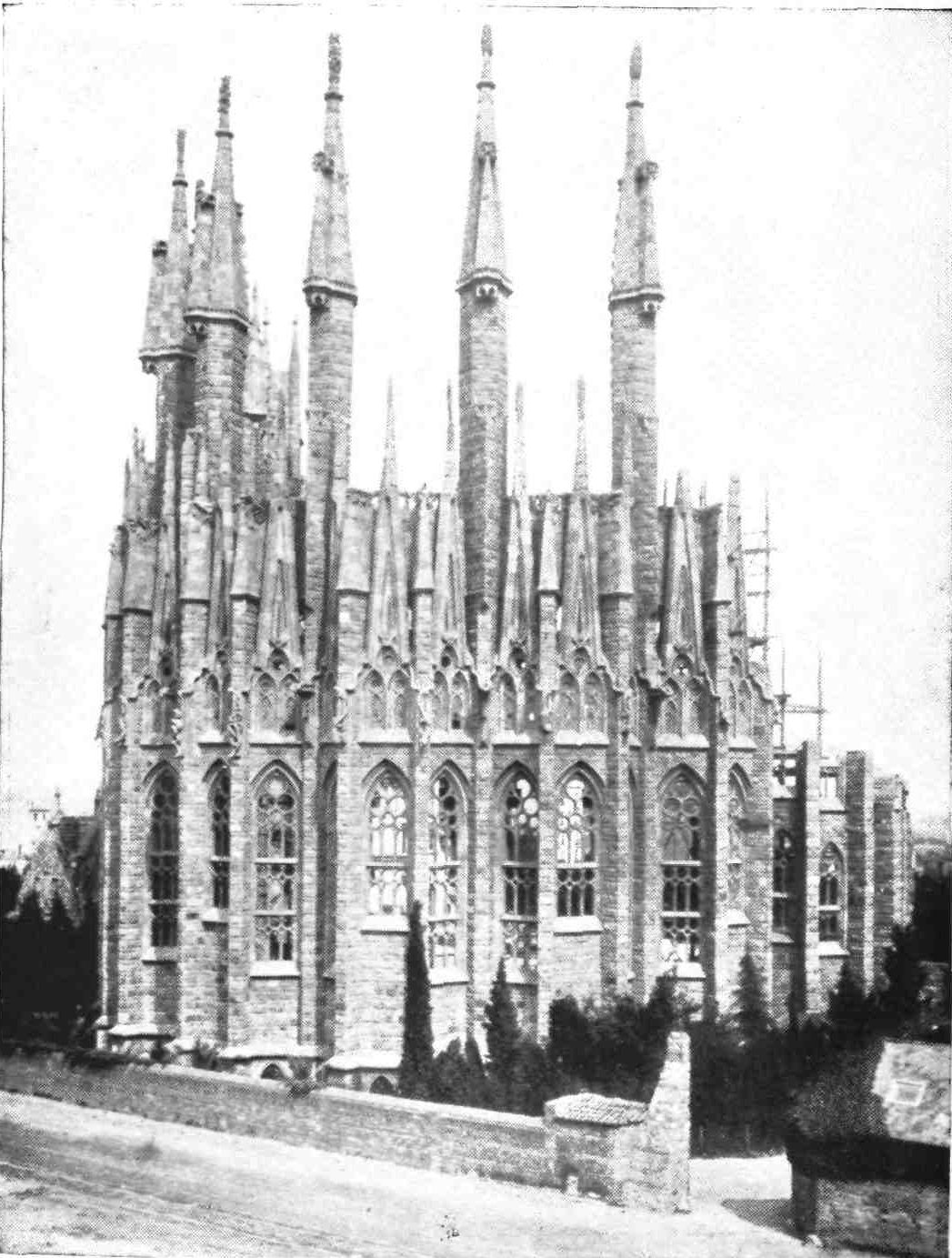 The primitive Cathedral was built by Count Ramón Berenguer between 1046 and 1058, and{10} considerably enlarged in the year 1173. The building, not yet satisfying the needs of the thriving city, was entirely rebuilt at the beginning of the fourteenth century. The design is attributed by Street to Jaime Fabre, a native of Majorca, who was succeeded as master of the works in 1388 by Master Roque. The last stone of the vault was placed on September 26, 1448.