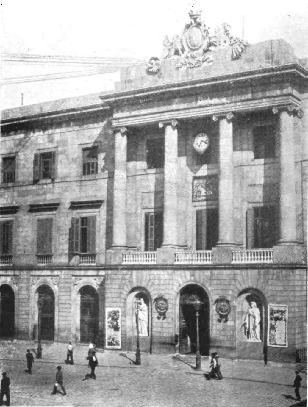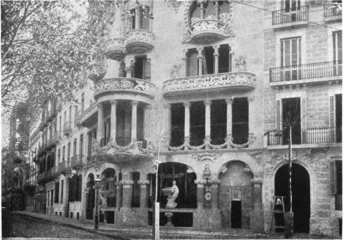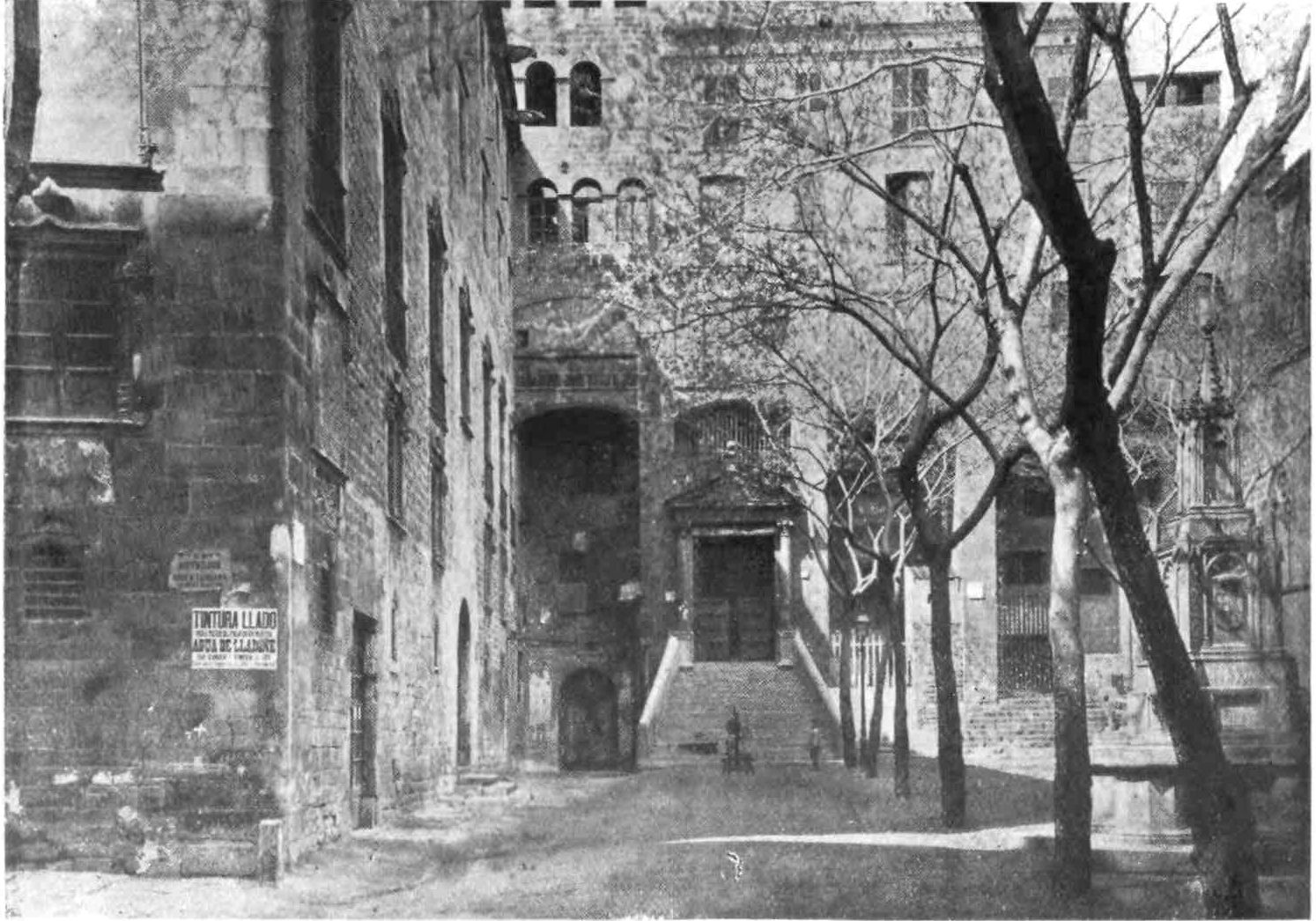 One instinctively searches at Barcelona for monuments of civic state befitting a city of such antiquity and dignity. Happily such are not lacking and have been preserved to us. The noble Gothic façade of the Town Hall (Casa Consistorial), erected in 1373, has been recently restored, fortunately with good taste. The Council Chamber (Salon de Ciento), formed of two bays which support an artesonado roof, is lined by a collection of portraits of Catalan worthies, among whom we distinguish Capmany, Villadomat and Montaner. A finer building and preserving more of its primitive character is the Diputacion, the old Parliament House of Catalonia, and now the seat of the Provincial Court. This monument, declares Piferrer, “is the admiration of foreigners and the honour of Barcelona. He who seeks for originality of style, let him examine all its parts and be convinced that many are of a character entirely new.” Built in the early fifteenth century, it underwent frequent restorations and enlargements, and was rebuilt in great part in 1609 by Maestre Pere Blai, who spared the best portions of the old work. The principal façade is cold and devoid of interest, except for the figure of St. George above{21} the entrance. To that saint is dedicated the chapel, with its fine ogival portal, and the adjoining wall damascened (to quote Piferrer) with reliefs. The chapel is the repository of an exquisite altar frontal, worked with the design of St. George and the Dragon, and designed by Antonio Sadarni, in 1458. The pillars sustaining the galleries of the patio, at one time much admired for their daring and ingenious execution, were bending and giving way under the strain till restored and strengthened a few years ago by Don Miguel Garriga y Roca, a local architect.