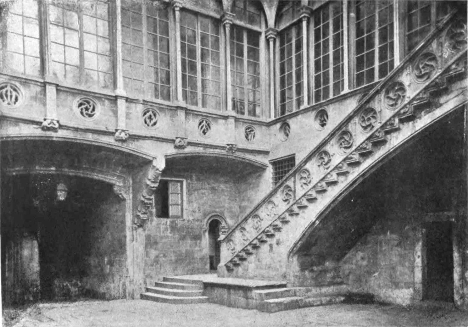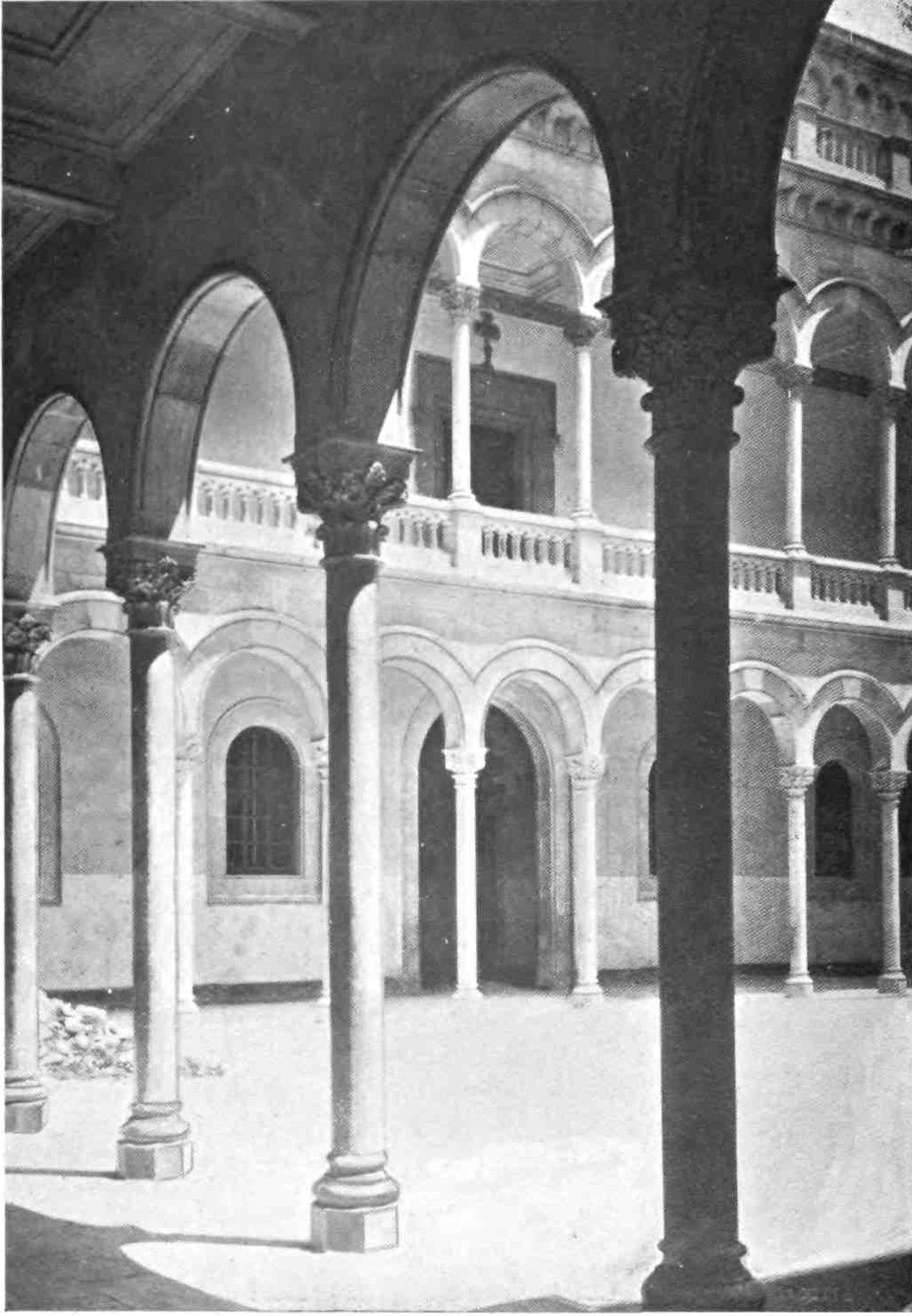 The north side of the church abuts on the great cloister, dating in its greater part from the thirteenth century. The windows on the south side are round-headed, those on the other three sides pointed, with good traceries. Through a round-headed arch we enter the chapter-house, divided into three aisles by four pillars, so slender as in no way to interrupt the view of the whole. The groining springs so gracefully from the capitals that the pillars themselves have the appearance of shooting up and bending like the branches of a tree. Then there is the library which once contained 10,145 volumes, including 385 valuable codices, and 250 MSS. in various styles of handwriting—forming a complete museum of calligraphy. This library is a noble chamber divided by four columns. Its walls were once hung with the portraits of the Kings of Aragon and their great nobles. Reminiscent of the brave days of old is the charming façade of{68} the palace built by good King Martin and intended by him to be a retreat in his old age. He died before its completion and the work was abandoned.