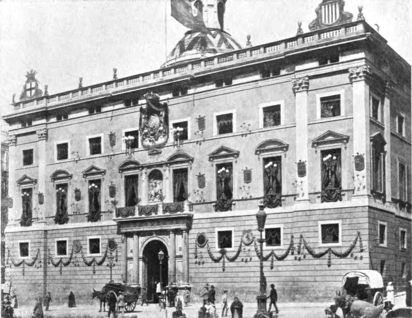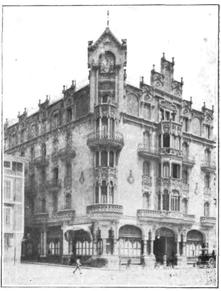 The halls breathe the dignity and gravity of a great corporation. The majestic Salon del Tribunal with its dome and hangings is adorned with portraits of the Kings of Spain, and paintings by Fortuny, one representing the victory of Marshal Prim over the Moors at Tetuan. Catalonia keeps ever green the memory of her heroes.