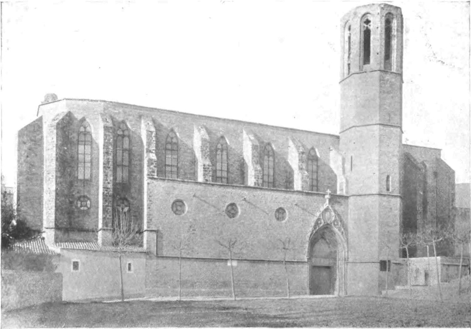 The churches of Santa Maria del Pino and of Santos Justo and Pastor are on the same plan, with slight modifications. Adjoining the former is a tall detached belfry, producing a fine effect. The church was consecrated in 1453, and derived its name according to one account from an image of the Virgin found in the trunk of a pine. The west front, Street considers to have been designed by the architect of the north transept door of the cathedral. Unlike Santa Maria del{18} Mar, there are no chapels in the apse, though they are found between the buttresses of the nave. There is no aisle. In this church Villadomat is buried.