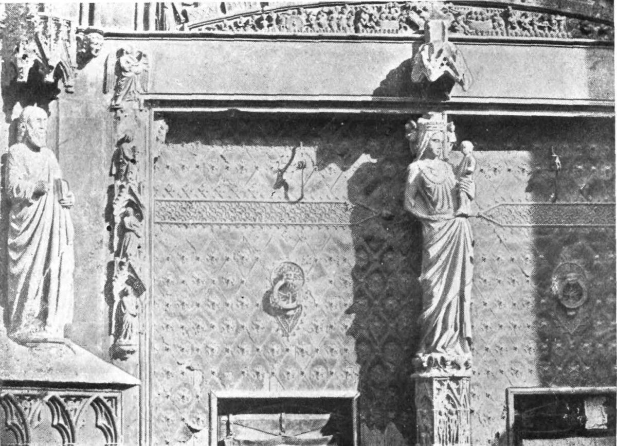The west front is striking; it was begun in 1278, but not completed for another hundred years. The lower half is occupied by a deep-set portal of four orders, rising to a point. The jambs are occupied by figures of saints under canopies, and these are continued round the two buttresses which flank the doorway and end in pinnacles. The shaft is formed by a statue of the Madonna upon a pedestal, the sides of which exhibit in relief the scenes of the Creation and Fall. “These subjects are very fitly placed here, the Fall in the centre coming just under the feet of her who bears Our Lord in her arms, and thus restores the balance to the world.” (Street.) The tympanum is pierced with rich geometrical tracery. Over and behind the cross surmounting this grand doorway is an enormous rose-window. The whole is surmounted by a gable, the central portion of which has disappeared, giving a somewhat ruinous appearance to the church when seen from a distance. Flanking this, the front of the nave, are the round-arched entrances to the aisles, with round windows above, betraying{55} Norman influence. Ford states that the great rose-window is Norman work.