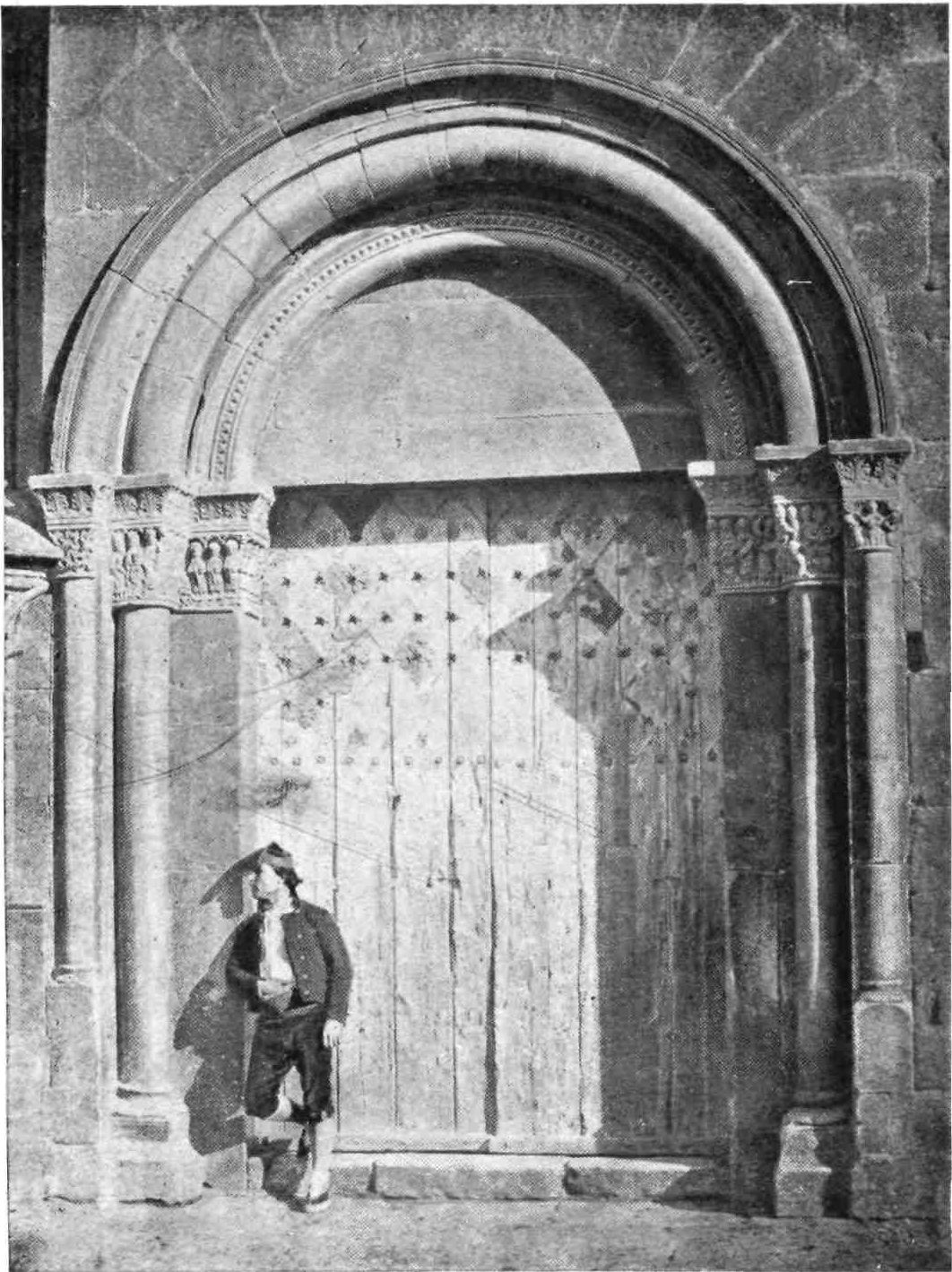 Five or six miles farther down the valley stands Ripoll, one of the towns that suffered most severely during the Carlist wars. It has, however, long since recovered from its reverses. Unfortunately the damage done to the monastery founded by Wilfred the Hairy cannot be repaired. As the Mausoleum of the counts from the ninth to the twelfth century, it possessed great interest. The church, built by Bishop Oliva about the thousandth year of our era, is roofless. The nave terminates in an apse, and there are three smaller apses opening from the east into each transept. The special glory of the building is its west porch, formed by a rounded arch with three shafts in each jamb. The middle shafts are carved into life-size figures of St. Peter and St. Paul; the others are most beautifully chiselled. The orders of the arch are variously treated; caprices, grotesques, masques, mythological designs being interwoven with more appropriate religious symbols. One series of reliefs appears to represent the twelve months.