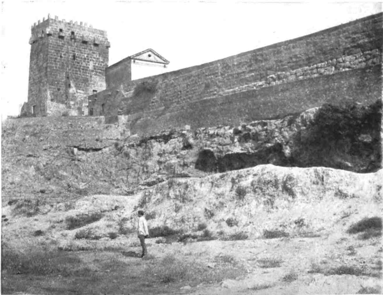 These edifices apart, the Middle Ages have done little for Tarraco togata. Its remaining monuments belong to its infancy and prime. The Cyclopean walls, now declared a national monument, extend from near the Puerta del Rosario to the crest of the hill on which the city stands, and thence to the eastern angle of the ancient prætorium, now converted into a prison. The base of this wall is formed by huge blocks of unhewn stones, uncemented, and with their interstices filled by smaller stones. The character of the work bespeaks the primitive nature of the builders. On this rude foundation rests the more regular work of the Roman conquerors. The enceinte formed by these walls is of the shape of an irregular polygon, measuring three-quarters of a mile across, and open on one side. The angles are defended by square towers, and the curtains are pierced by gates, to some of which the name “Puerta ciclopea” is given. The{60} Puerta del Rosario, called in the Middle Ages “Portal de Predicadors,” is about eight yards thick and is roofed by an enormous block of stone about 36,000 kilogrammes in weight. On the stones composing the Roman part of the wall, Iberian letters are traced. These were merely masons’ marks for the guidance of the native workmen, and form no words. The Torre del Arzobispo was raised in Christian times on the old Roman tower. The wall extending to the Torre del Capiscol is attributed to the Scipios, and dates in any case from their time. The principal Roman gate, called the Puerta del Socarro, is a noble work formed by three concentric arches. Passing through this we obtain a fine view of the strip of wall built by order of Hadrian, and may re-enter the city by the eighteenth-century gate of San Antonio, which pierced a wall built or restored by Norman adventurers in the twelfth century.