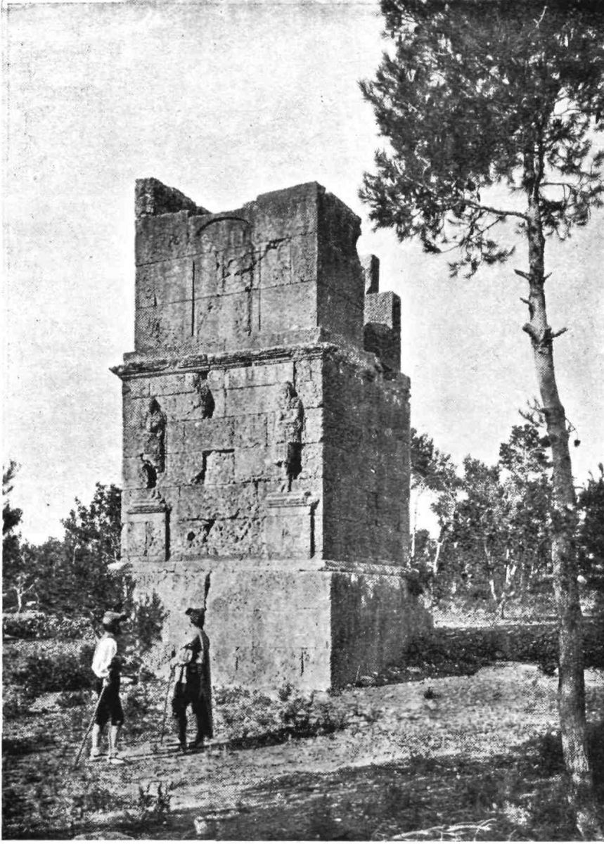 Within the city itself not much remains from Roman times. The sites of the forum, the prætorium, and the great temples may be traced easily enough, and stones hewn by Roman hands and commemorating often enough Roman dead, are embedded in the walls of houses and churches all over the town. The local museum contains a few of the spoils of antiquity. There is a beautiful statue of Dionysus in Parian marble,{61} and a great variety of votive inscriptions. For more substantial memorials of the Roman era we must leave the city and follow the Barcelona road some four or five miles. Here we reach the celebrated monument known as the Tomb of the Scipios, consisting of a rectangular base and an upper body, on one face of which are sculptured in high relief the figures of two warriors. The cornice is engraved with a legend in which the words “perpetuo remane” are alone decipherable. There is no ground whatever for supposing that the figures represent the brothers Scipio or that this monument marks their resting-place. It is more probably the sepulchre of some wealthy Roman settler.