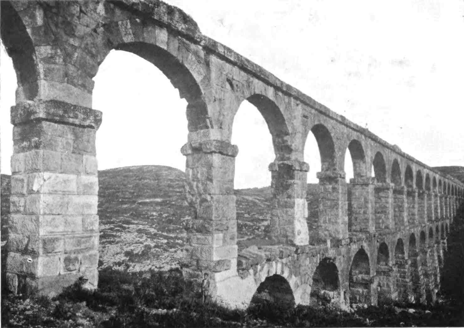 The noblest handiwork bequeathed to Cataluña by the conquerors of the world is, however, the Aqueduct, which may be compared favourably{62} as regards preservation and solidity with the more famous work of the same kind at Segovia. Where it spans a valley it is composed of two series of arches, eleven below and twenty-five above, and rising to a height of 217 metres. The stone of which it is built was Obtained from the caves of Monte Loreto, where the quarries may still be seen.