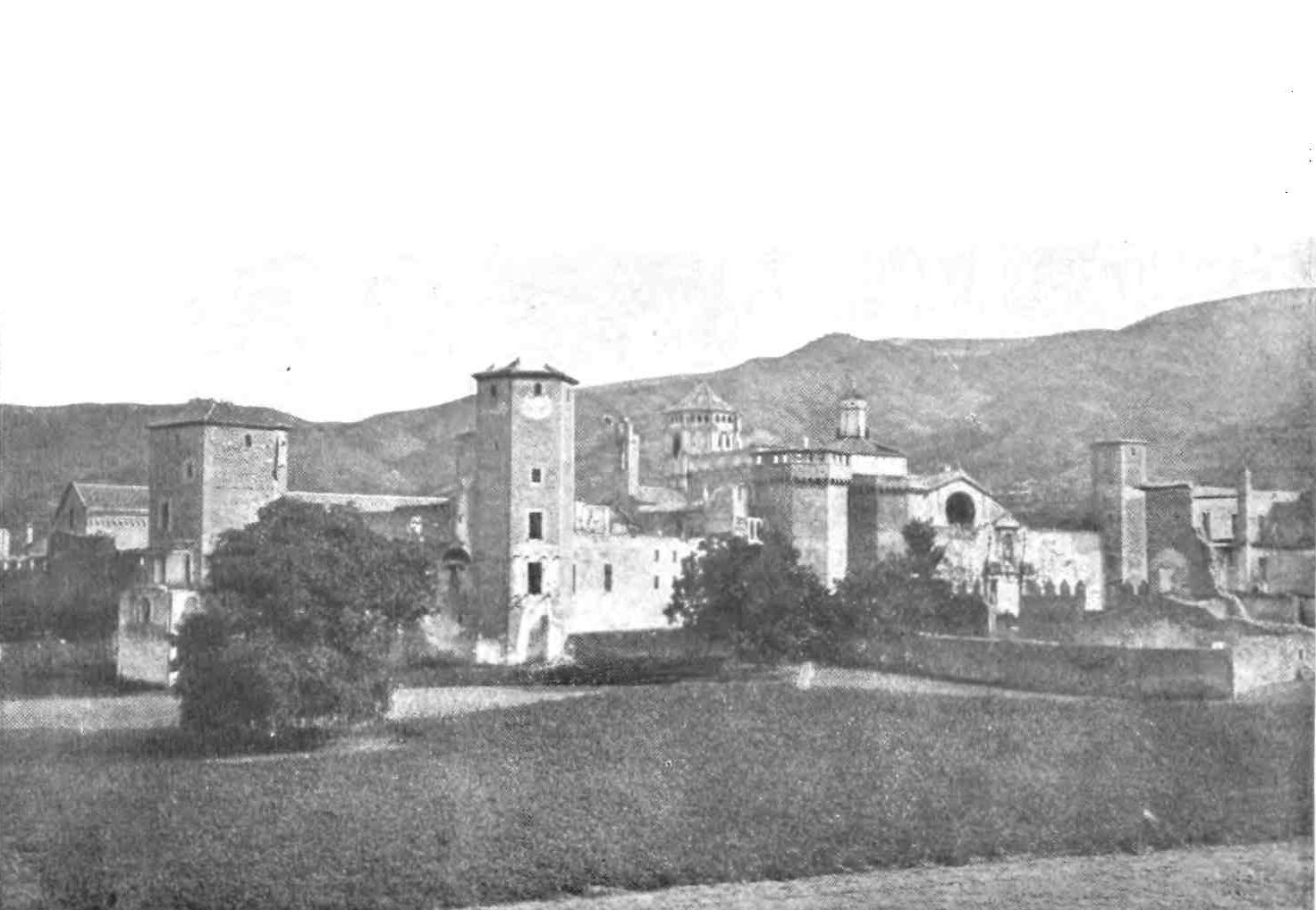 The rapid extension of the most populous city of Spain has fortunately spared several noble monuments of bygone ages and beliefs. About an hour’s walk from the Tibidabo brings one to the Romanesque monastery of San Cucufat (or Cugat) del Valles, founded by Charlemagne on the site of a Roman camp, and rebuilt between 1009 and 1014. The exterior is fortified with battlements and flanking towers, the main en{22}trance being pierced through a tall square gatehouse, and having been defended by a drawbridge. The Abbey Church is in the finest Romanesque style, with an octagonal lantern, apse, nave, and aisles. The interior is plain and sombre, despite the abominable baroque chapels which have been added to the right aisle. The church contains but one tomb of importance—that of the builder or founder, the Abbot Otho, who was also Bishop of Gerona, and flourished at the dawn of the eleventh century.