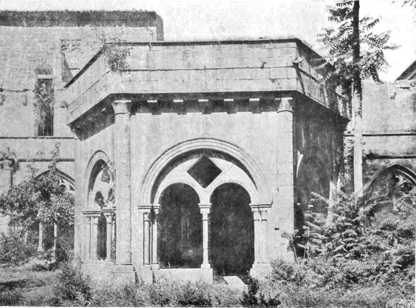 You may still traverse miles of cloister and hall at Poblet strewn with broken tablets, overgrown with shrubs and climbing plants. One of the most beautiful of the galleries is the Novices’ Dormitory, roofed in with timber; then there are the locutorium, the only spot where conversation was permitted between the recluses; the infirmary and the beautiful cloister of San Fernando, built in 1415 by order of the first king of that name, the little chapel of the saint, founded by the Count of Barcelona, and the royal apartments, built in 1375.{69}
