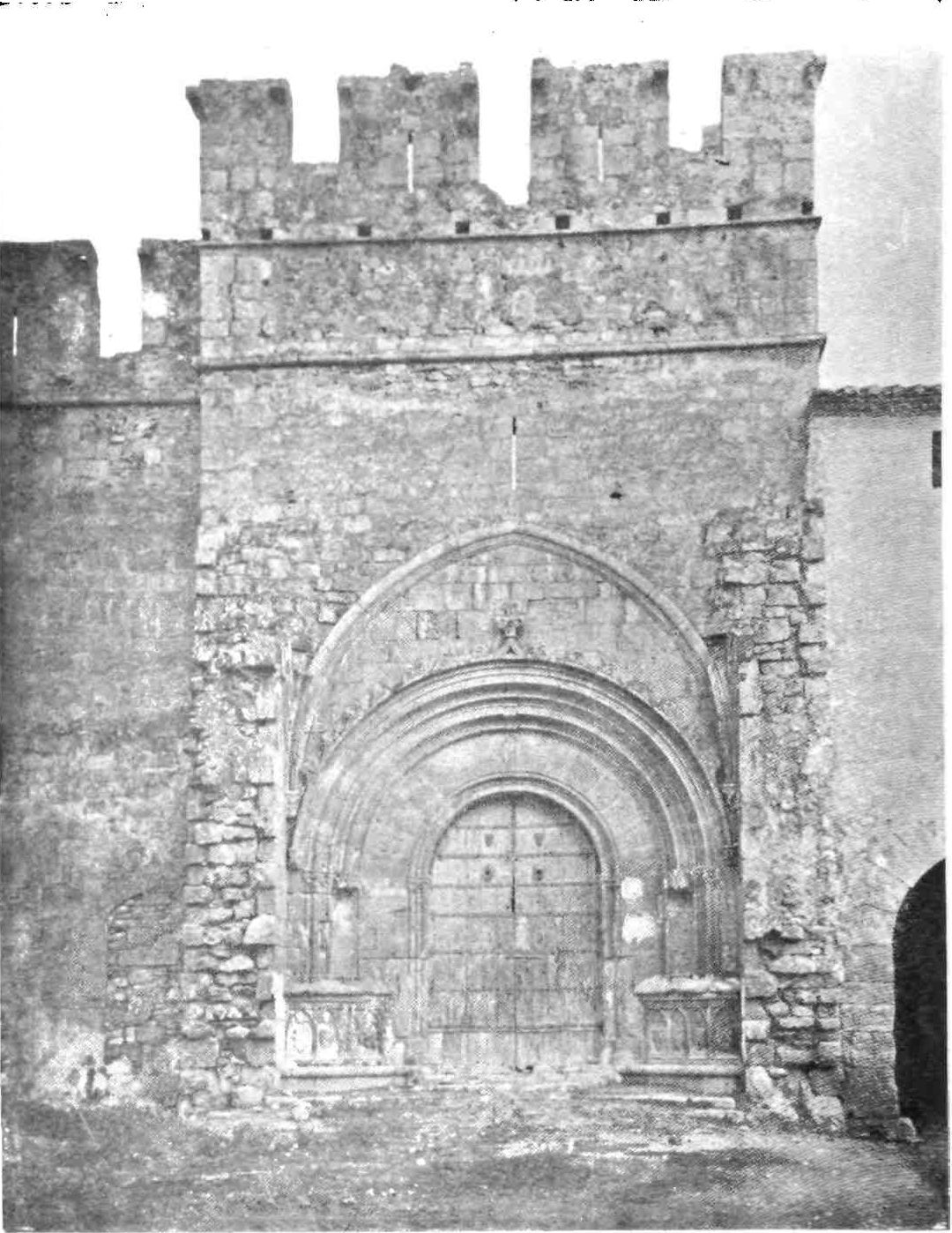 Santa Maria was consecrated in 1112 by Raimundo Guillen, Bishop of Barcelona, and{81} was served by Augustine canons down to 1592. It is contemporary with the church of San Pedro and both present an aspect of extreme antiquity accentuated by the Roman tablets and fragments incorporated with the structure. Close by are the ruins of a fortress and a chapel attributed by tradition to the Templars. On the other side of the prettily named Rio Vallparadis are to be seen the fragments of a tower and castle.