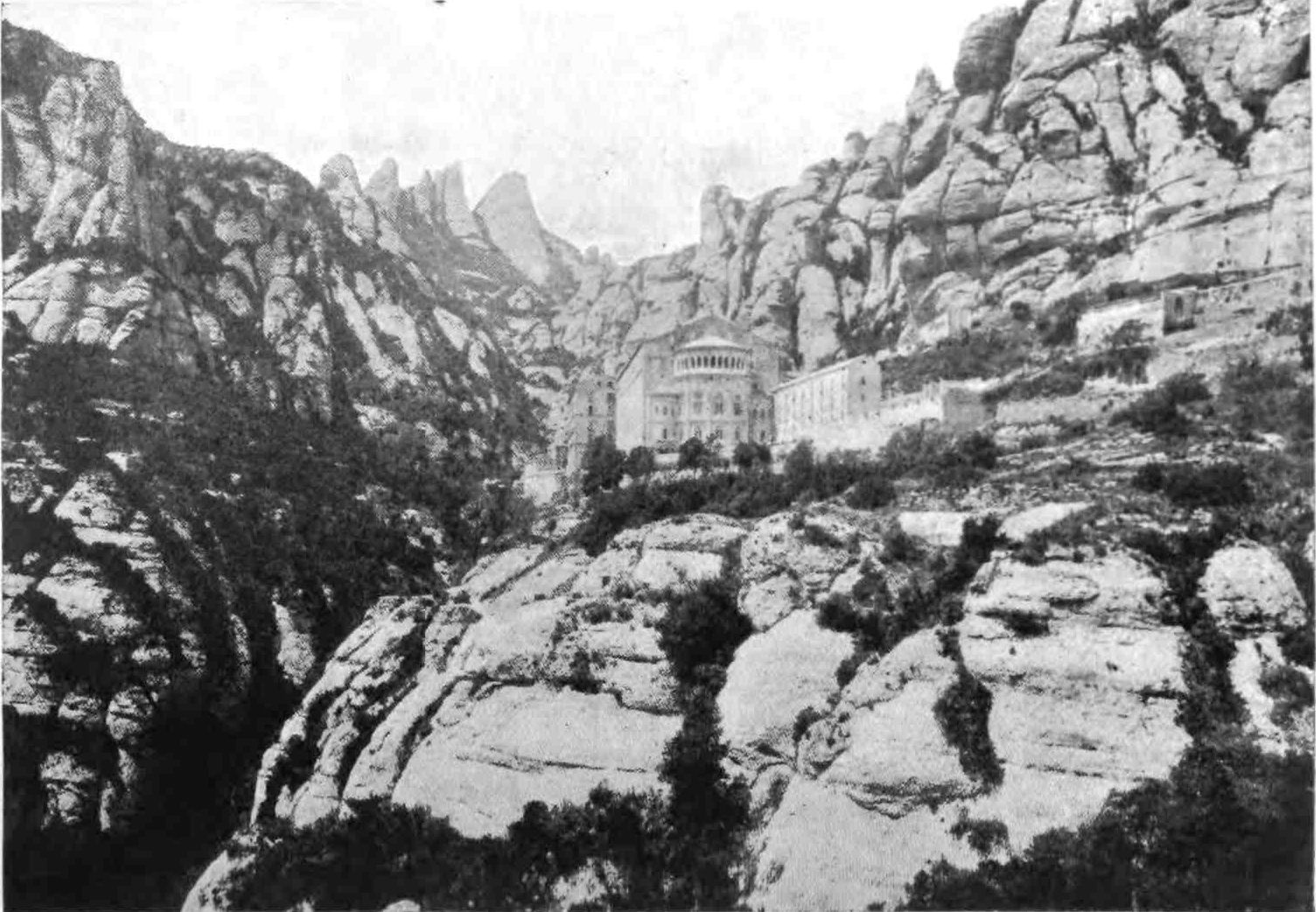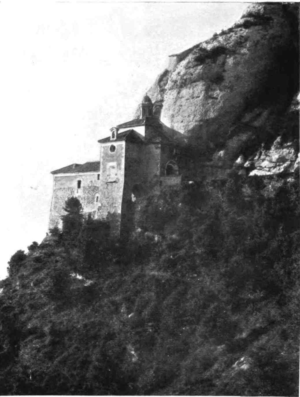 Montserrat, easily accessible from Barcelona, is one of the four or five renowned shrines of Christendom. The legend of its institution is one of the quaintest and at the same time silliest in the annals of hagiology. In the time, it seems, of Count Wilfred, the Henry of Barcelona, there dwelt on the mountain a hermit named Guarin whose sanctity was famed even to the ends of the earth. Church bells rang of their own accord when he passed, and the forces of nature were at his beck and call. This being so, when Richildis, the Count’s daughter (she was beautiful, of course), became possessed of a devil, Guarin was at once called in to turn him out. Such a task was a mere matter of an Ave and an invocation on the part of the holy man; but the devil thus incontinently expelled from the person of Richildis appears to have passed into the body of the hermit. He conceived an unlawful passion for the maiden, who remained with him after her cure, to learn the arts of sanctity. He succumbed to temptation and consummated his crime by murdering the girl, cutting off her head and burying her in his cave.{74}