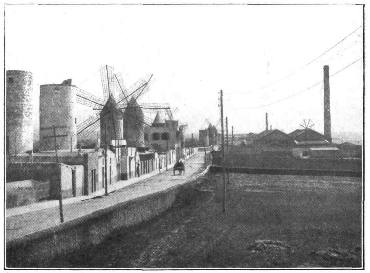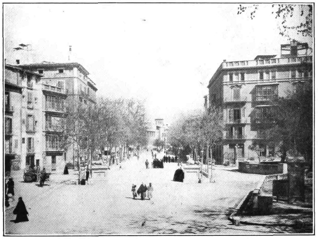Hard by is the estate of Ben Dinat, so named, it is averred, because the conqueror expressed in those two words his satisfaction with a meal of bread and garlic served him at this spot. It is more probable that the name is that of some long-forgotten Moor. Then comes the little harbour and tower of Portopi and round the next promontory the lovely bay of Palma, with the capital of the Balearics smiling a welcome to the stranger. The walls that once surrounded the city have been demolished: the turrets that rise above the house-tops are those of the Cathedral and the Exchange (Lonja). We enter the town through the Water Gate, a building not without majesty, and crowned by a statue of the Blessed Virgin. The streets, as in most Spanish towns, are narrow and shady, often rewarding the curiosity of the passer-by with glimpses of Renaissance patios, graceful balconies, and turret windows. Among the most interesting houses of the Butifarras (big sausages), as the nobility of the island used to be called, are the Casa de Vivot and the palace of the Counts of Montenegro. But Palma is a living city, and side by side with these{91} dignified memories of the past we find handsome modern buildings such as the Bank of Spain and the Hall of Provincial Deputation. Nor does Palma want for wide breathing-spaces and promenades. It has the fine Paseo del Borne and the Boulevards constructed round the bay and on the site of the old fortifications. Close to the landing-stage the new-comer’s attention is first attracted by the Exchange or Lonja. Charles V. on visiting the island for the first time hastened at once to see it, eagerly demanding if it belonged to the Church or to the State, and was visibly relieved on hearing that it was a civil edifice. The Lonja is a quadrangular building, surmounted by a crenellated balustrade and flanked at each angle with an octagonal tower of six stages, one of these rising above the balustrade. The walls are strengthened with graceful pilasters, and pierced in their lower story by ogival windows with good traceries. The door is square and enclosed within an ogival arch. The interior forms a single great hall, the roof of which is supported by only four slender fluted columns, from which the arches spring like palm branches. This interesting building was designed and begun by Antonio Sagrera in the year 1426. Like the numerous other Spanish Lonjas, it has long been deserted by the mercantile community.