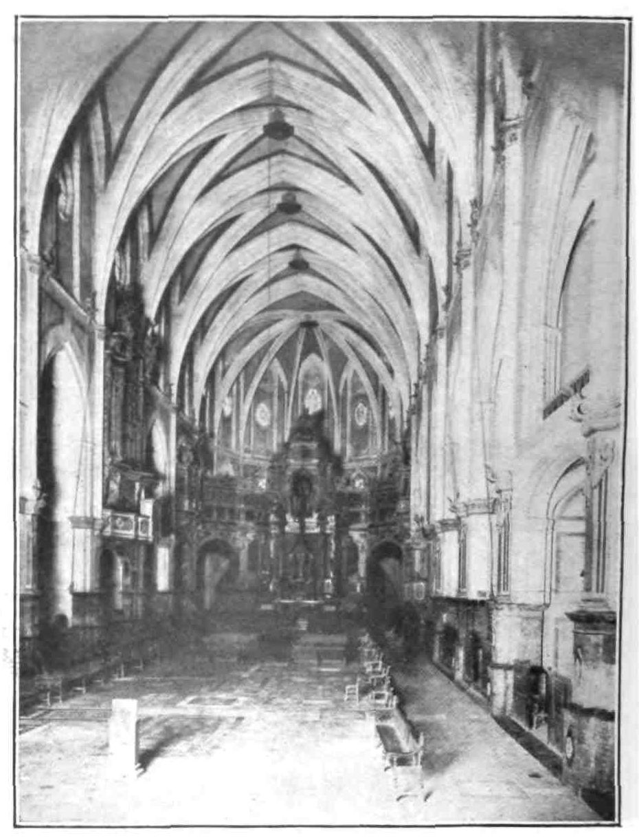 We may trace the footprints of St. Ignatius to Manresa, a name dear to the Jesuit in all lands, and borne by the Manchester of Cataluña. It is a lively, picturesque town, built on an amphitheatre of hills on the left bank of the Cardoner. High over the factories towers the Collegiate Church begun in 1328 and finished, probably, a hundred years later. It is one of those wide-naved churches characteristic of the principality, its span of nave is, in fact, greater than{79} that of any cathedral with aisles, except Palma. An interesting peculiarity is the flying buttresses built partly in and partly outside the church. Over the first roof rises an impressive bell tower. The interior is disappointing. The side chapels are Gothic. There is some good glass in the clerestory windows, and the organ displays one of those Saracens’ heads we so often find in Catalan churches. In the archives are some interesting pictures by local artists, reminding one of Byzantine work, and there also is preserved that altar frontal which excited the fervent admiration of Street. In a vault beneath the presbytery are treasured the relics of St. Agnes and St. Maurice, translated here from Vienne on the Rhône in the time of Berenguer III.