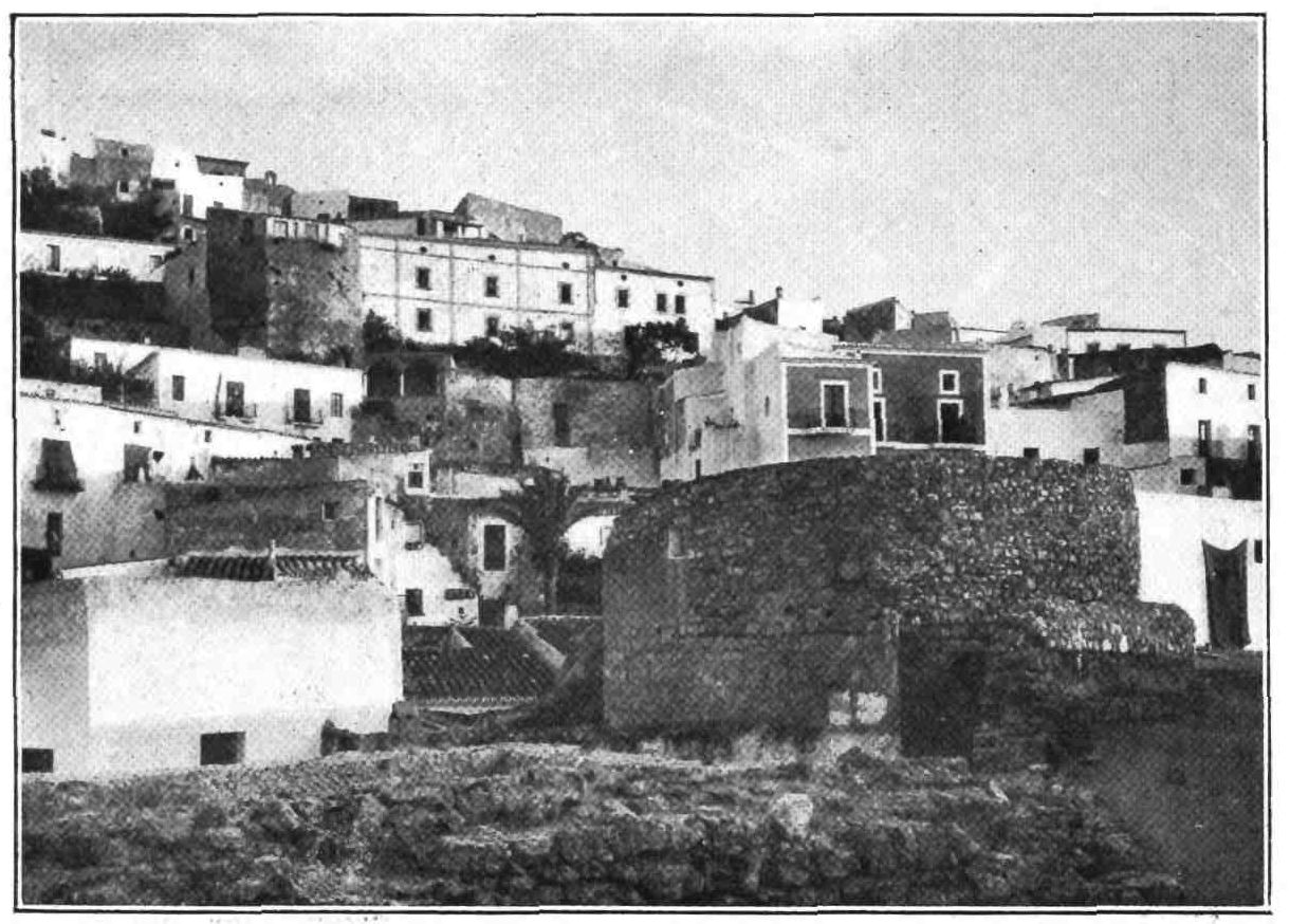 Ibiza, the third largest island of the group, is one of those spots which can afford no sort of justification for its existence. It is a mere backwater, a stagnant pool of humanity, interesting, though, as a place buried beneath prejudices and customs hundreds of years old. How should they be blown away in so out-of-the-way an island? The town stands on a fine harbour and reminds one rather of Guernsey. The collegiate church, formerly a cathedral, was founded by the Archbishop of Tarragona, in the thirteenth century, at the time the island was granted to him by{105} Jaime the Conqueror. It is uninteresting, except for the view from the belfry. Better worth a visit is the fortified church of San Antonio at the other end of the island, wherein the people took refuge at the approach of the Corsairs. It is flanked with two massive towers and the apse has a parapet pierced with embrasures for guns. The walls are nearly eight feet thick, and the doorway is protected by a machicolation.