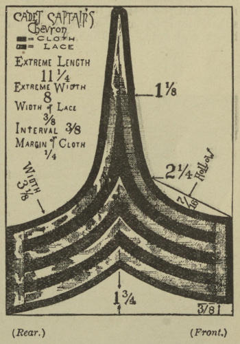 [52] Chevrons are made of gold lace ⅜ inch wide; sewed on dark blue cloth with ⅜ inch intervals between the bars.