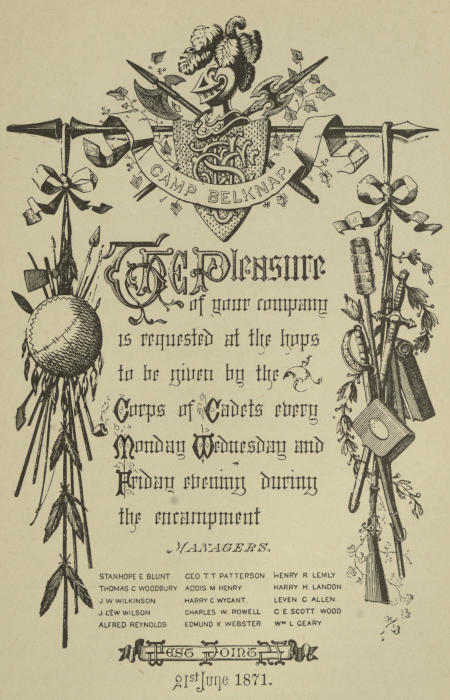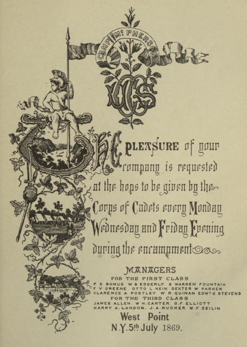 As an amusement for him, I read chapter after chapter, as it was written, to a favorite nephew,[8] and when the manuscript was written and in a temporary binding, I loaned it to this young relative, who, in turn, with my consent, loaned it to friends of his, and it was read by these youngsters and passed from hand to hand. I could not help but realize the interest that was taken by these young readers in what I had so carelessly and indifferently written, but at the same time, I should never have undertaken the publication of my notes if my nephew had not attended a military school and bombarded me with appeals to send him the old manuscript, so that his comrades might read about life at West Point.