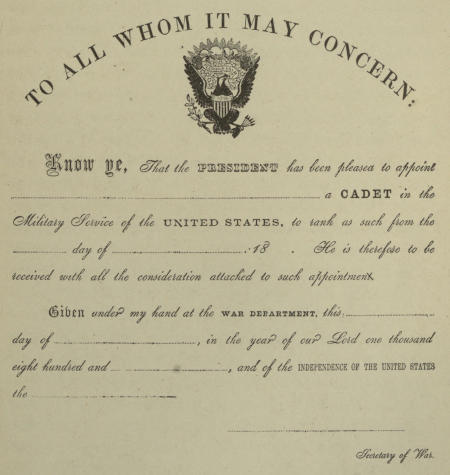 [63] The army is supplied with second lieutenants from four sources, viz.: First, the Military Academy; second, graduates from other military schools; third, from meritorious enlisted men, and fourth, from civil life.