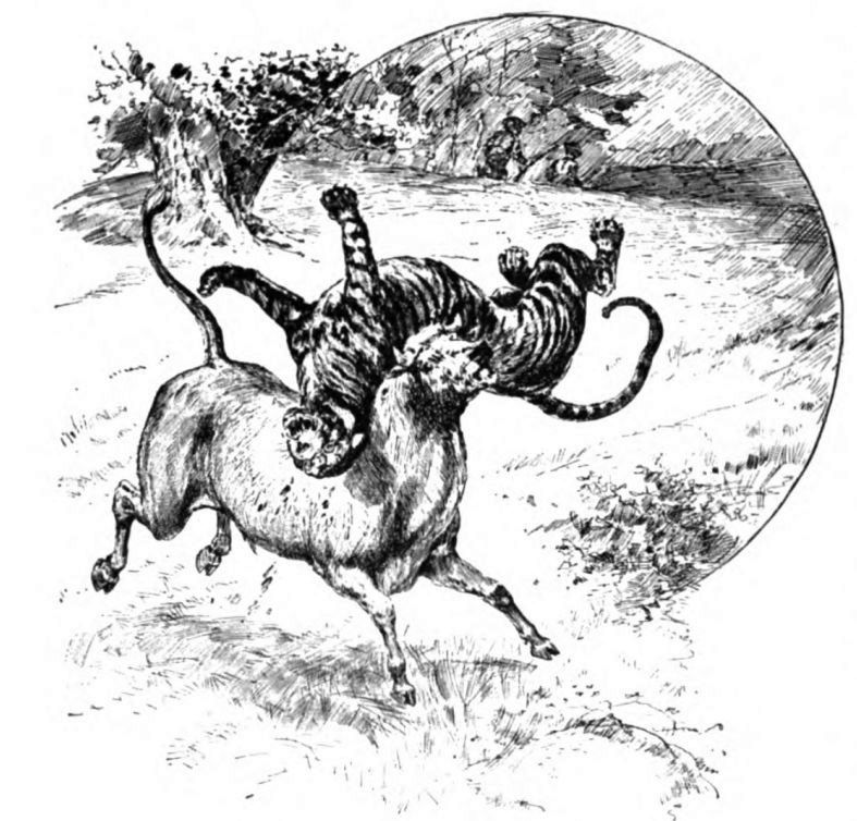 There, creeping close to the ground, was a powerful yellow shape, marked with jet-black stripes. The ears were flattened, and the long tail, reaching straight out on a level with the body, had a wavy motion that I distinctly remember to this hour. Warily, silently, and just upon the point of making a spring for his victim, the fearful creature was stealing upon the unsuspicious bull.