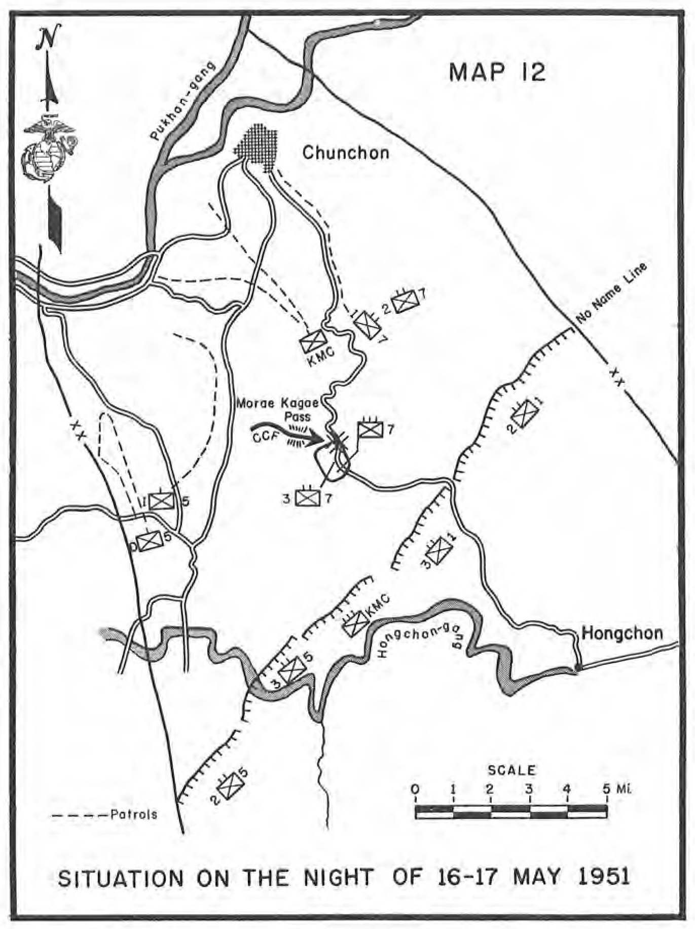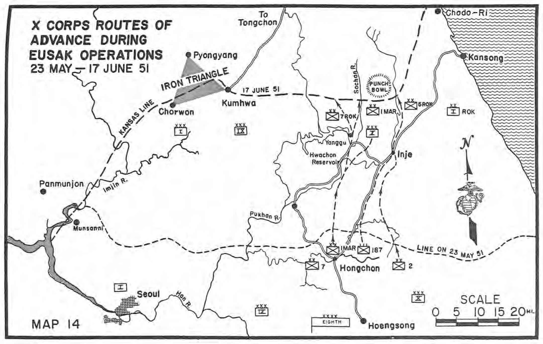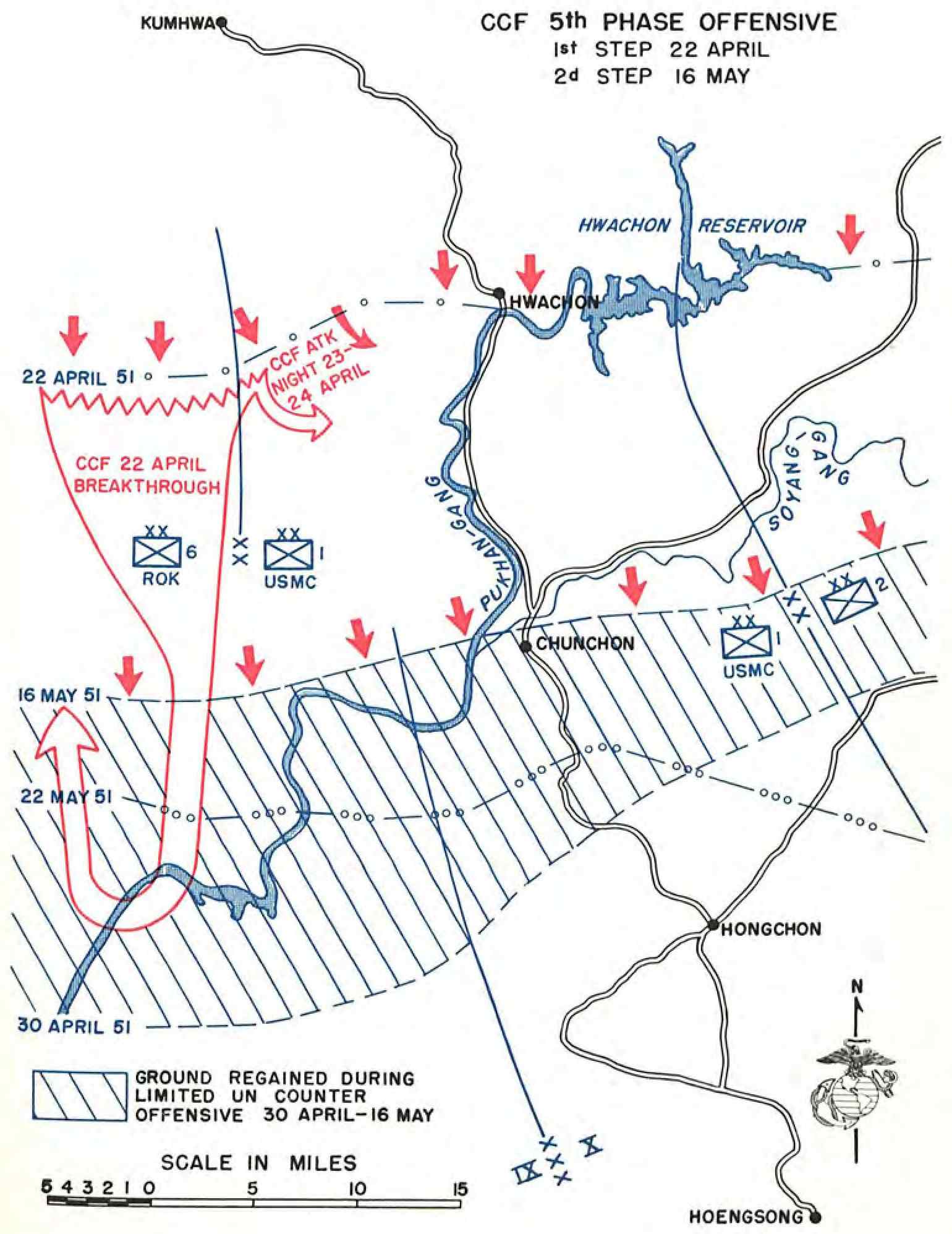 | Prisoners Reveal Date of Offensive—Hwachon Occupied by KMC Regiment—CCF Breakthrough Exposes Marine Flank—MarineVIII Air in Support Everywhere—Plugging the Gap on the Marine Left—Repulse of Communist Attacks—Withdrawal to the KANSAS Line—Enemy Stopped in IX Corps Sector—1st Marine Division Returns to X Corps | ||