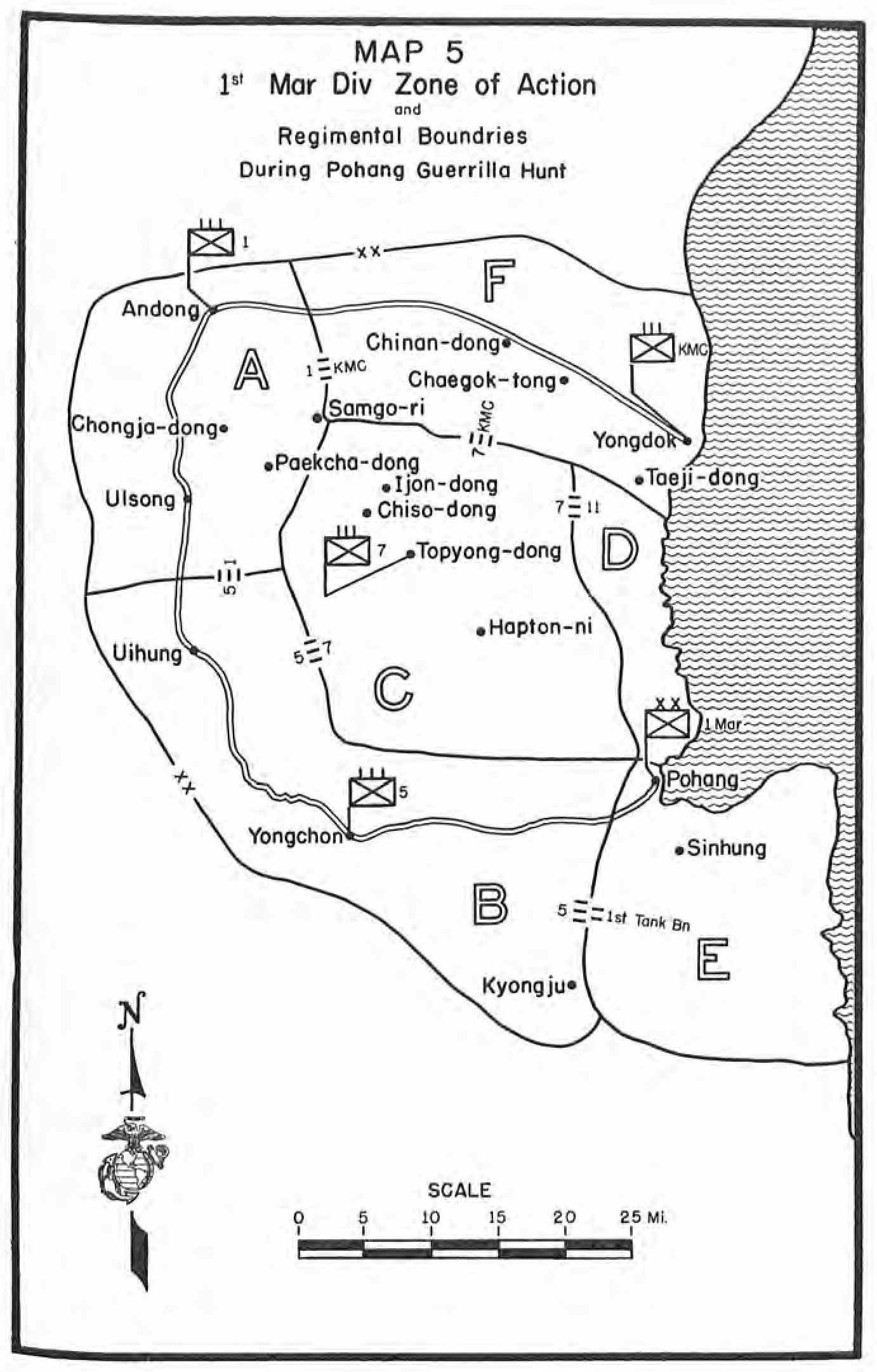 | The New Marine Zone of Operations—1st MAW Moves to Bofu—Marine Rice Paddy Patrols—Operations Thunderbolt and Roundup—Action in the Pohang-Andong Zone—KMC Regiment Joins 1st Marine Division—10th NKPA Division Scattered—New Mission for the Marines | ||