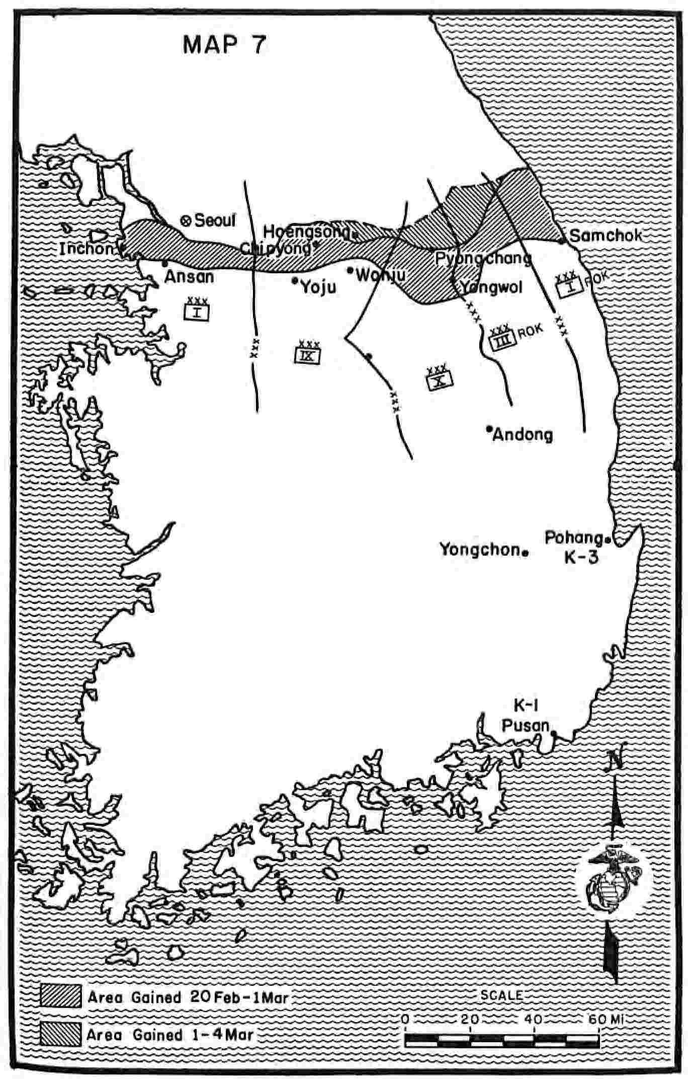 | The Move to the Chungju Area—Marine Planes in Action—Planning for the New Operation—The Jump-Off on 21 February—Stiffening of Chinese Resistance—General Smith in Command of IX Corps—The Advance to Phase Line ARIZONA—JOC Air Control System Criticised | ||