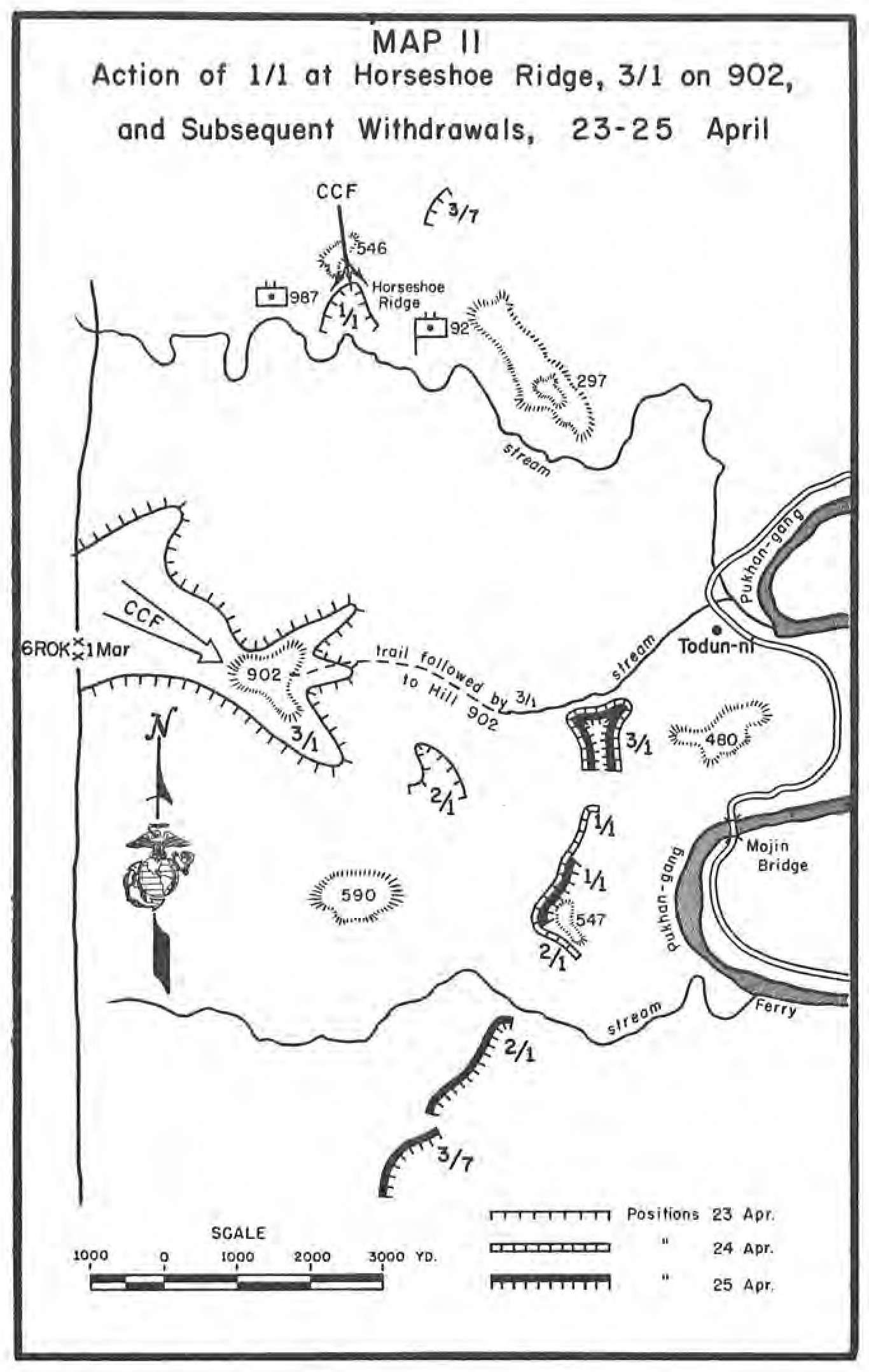 The period covered in this volume begins in the latter part of December 1950, when the Division rested in the Masan “bean patch,” and continues through the guerrilla hunt, the Punchbowl fighting, and all other operations during 1951. The account ends when the Marines move to positions in the west during March 1952.
