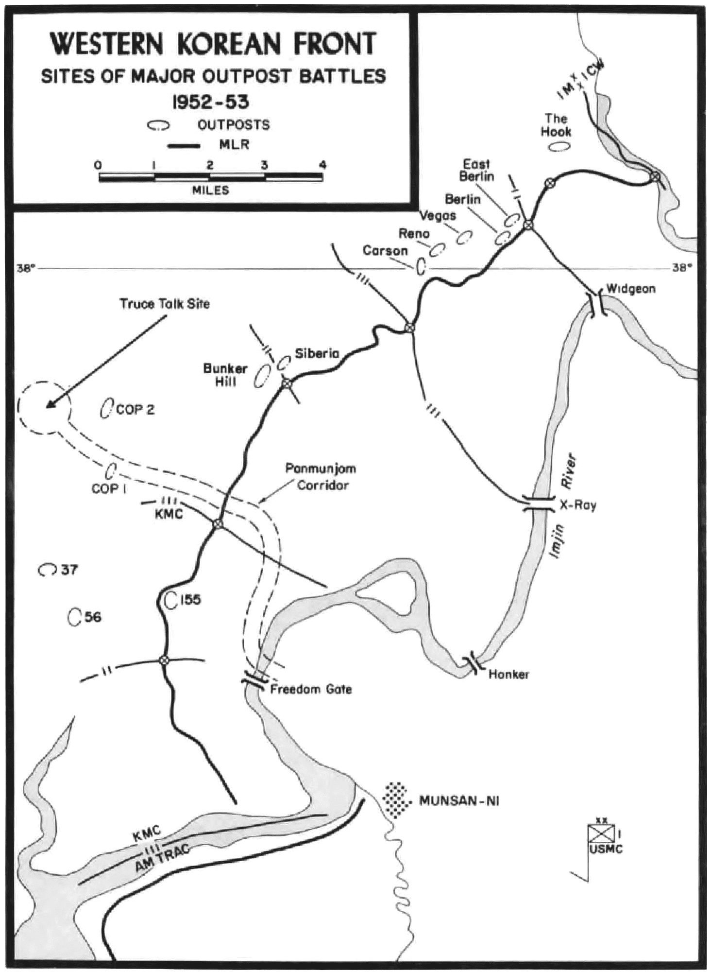 In March 1952 the 1st Marine Division redeployed from the East-Central front to West Korea. This new sector, nearly 35 miles in length, anchored the far western end of I Corps and was one of the most critical of the entire Eighth Army line. Here the Marines blocked the enemy’s goal of penetrating to Seoul, the South Korean capital. Northwest of the Marine Main Line of Resistance, less than five miles distant, lay Panmunjom, site of the sporadic truce negotiations.