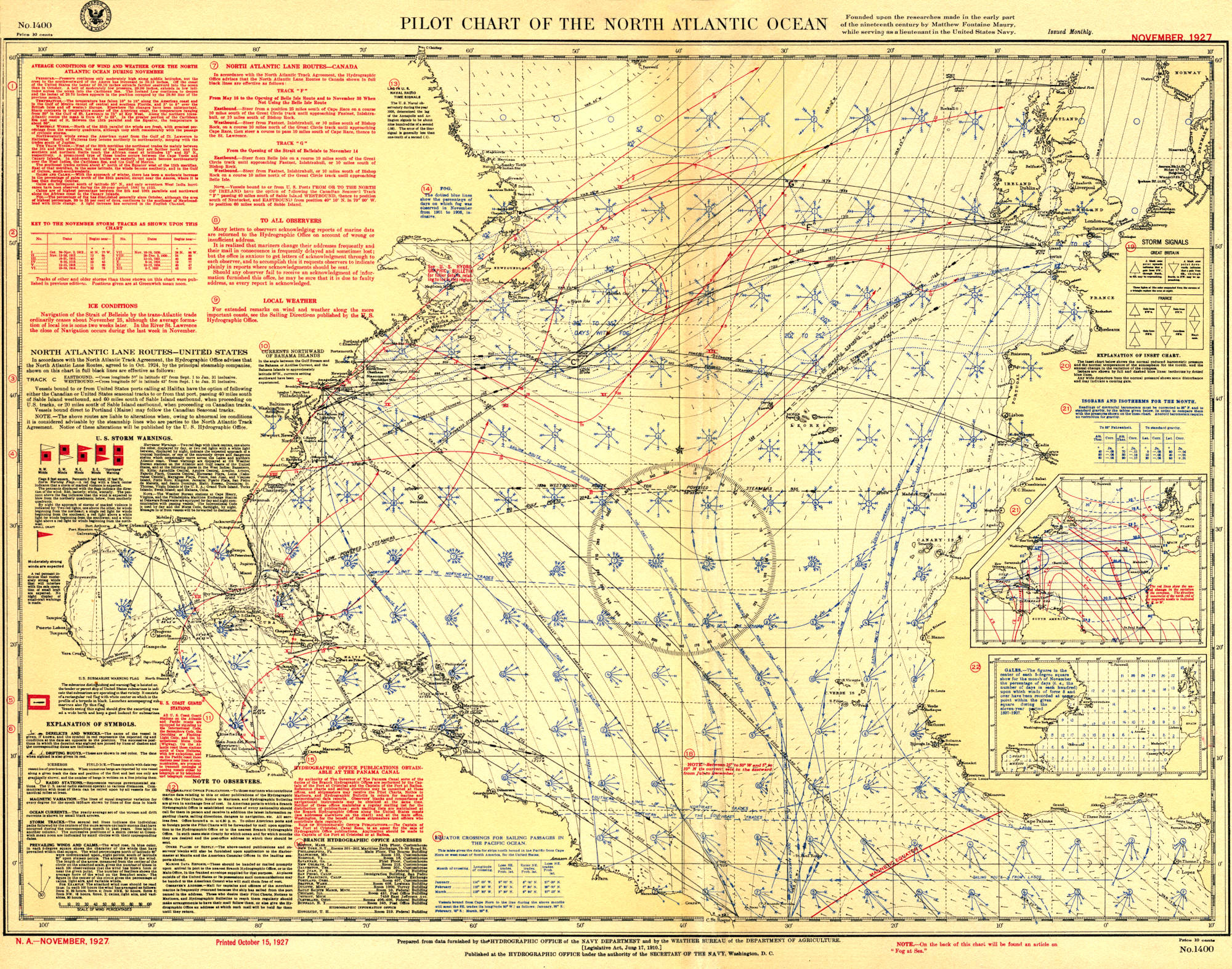 By authority of The Governor of The Panama Canal some of the duties of the Branch Hydrographic Offices are performed by the Captain of the Port at Cristobal and the Captain of the Port at Balboa. Reference charts and sailing directions may be consulted at these offices, and shipmasters may receive the Pilot Charts, Notice to Mariners, and Hydrographic Bulletin in return for marine and meteorological data reports. Observers’ blanks and comparisons of navigational instruments may be obtained at the same time. Neither of these offices maintains a regular mailing list for the distribution of publications; such mailing lists are maintained at the Branch Hydrographic Offices along the United States coasts (see addresses elsewhere on the chart) and at the main office, Washington, for the benefit of those shipmasters and officers who contribute data regularly.
