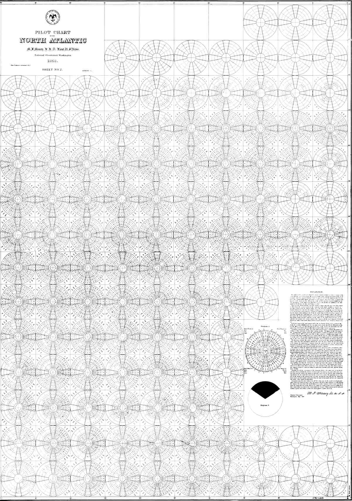 In his examination, Maury passed twenty-seven in a class of forty. An explanation of this apparently low standing may be gathered from the following account of the manner of conducting such examinations: “The midshipman who seeks to become learned in the branches of science that pertain to his profession, and who before the Examining Board should so far stray from the lids of Bowditch as to get among the isodynamic and other lines of a magnetic chart, would be blackballed as certainly as though he were to clubhaul a ship for the Board in the Hebrew tongue.... Midshipmen, turning to Bowditch, commit to memory the formula of his first or second method for ‘finding the longitude at sea by a lunar observation’. Thus crammed or ‘drilled’, as it is called, they go before the Board of Examination, where, strange to say, there is a premium offered for such qualification. 22He who repeats ‘by heart’ the rules of Bowditch, though he does not understand the mathematical principles involved in one of them, obtains a higher number from the Board than he who, skilled in mathematics, goes to the blackboard and, drawing his diagram, can demonstrate every problem in navigation”.[2] Maury, no doubt, wrote this out of his own personal experience; and even though the results of his examination may have indicated that in the ordinary duties of his profession he was not above the average, still it was to be in a special field of the service that his genius was to display itself.