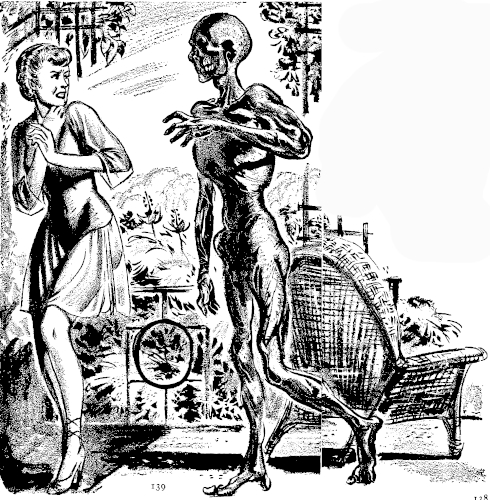 "It isn't that, Joe," she said. "I'd have squawked long ago if those little things made any difference. I like handling things myself rather than turning them over to some robot. It's fun to cook and get wood, but Joe, it's no fun when a thing rises out of the steam and screams at you. It's no fun when electric sparks jump over the house and all of a sudden there's only fear, the whole place is choked with fear—" She shuddered closer against him.