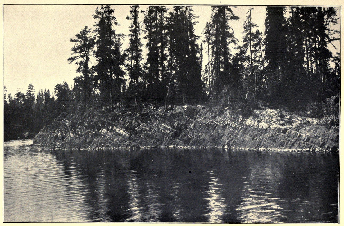 Like the other formations of the region, the Laurentian is cut by diabase dikes of post-Huronian age which, owing to their dark colour, are conspicuous among the lighter granite rocks. In the neighbourhood of Zigzag lake they are abundant, and are usually from twenty 25to sixty feet or more in width, the smaller of which are not large enough to map.