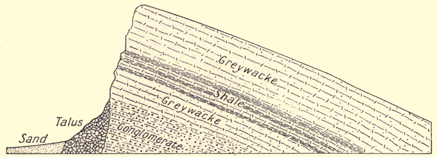 By the disappearance of pebbles the basal conglomerate changes into a greywacke or a shale according as the cement is one or the other. Frequently this transition is marked by an alternation of lenticular beds of conglomerate with the greywacke, probably indicating varying conditions of depth or current in the water in which they were deposited. With the greywacke and shale is associated an impure quartzite or arkose, the whole forming a thick series whose members are not sharply separable one from another and do not occupy definite relative positions. For the well laminated finer grained beds the term slate is in general use, although a secondary cleavage by which this kind of rock is distinguished from shale does not exist. Nearly all the prominent hills in the north-western part of the area are composed of this series.