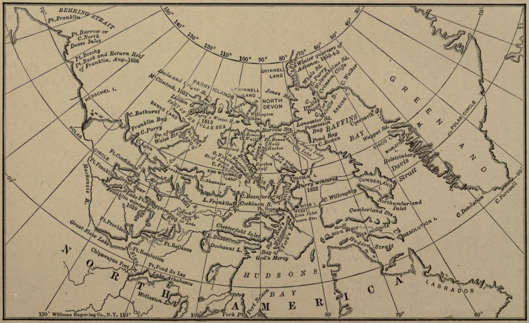 | Nineteenth century continued. Scoresby and Clavering.—Former visited Jan Mayen Island in 1817.—Later he visited east coast of Greenland.—Discovered Scoresby Sound. In 1824, Captain Lyon surveyed Melville Peninsula.—Adjoining straits and shores of Arctic America.—In 1825, Captain Beechey in the Blossom sailed through Behring Strait and passed beyond Icy Cape.—Surveyed the coast as far as Point Barrow, adding 126 miles of new shore.—Second voyage of Captain John Ross.—Undertaken in 1829.—Discovers Boothia.—Wintered in Felix Harbor.—Discovery of North Magnetic Pole by nephew of Captain John Ross.—Commander James Clark Ross.—Valuable observations.—Sledge journeys to mainland.—Four years spent in the Arctic.—Perilous retreat.—Safe return.—Land journey by Captain Back.—The Great Fish-Back River.—Point Ogle.—Point Richardson.—Back’s farthest point was 68° 13´ 57″ north latitude, 94° 58´ 1″ west longitude. Land journeys of Simpson and Dease, 1836.—Descend the Mackenzie River to the sea.—Surveyed west shore between Return Reef and Cape Barrow.—In 1839, they explored shores of Victoria Land as far as Cape Parry.—Crossed Coronation Gulf.—Descended the Coppermine.—Reached the Polar Sea. Overland journey in 1846 by Dr. John Rae confirmed Captain John Ross’s statement that Boothia was a peninsula | 57 |