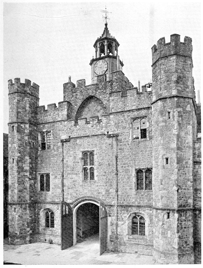 There are a few more items mentioned in the Lambeth papers, 1468–9: “Repairs at Knole. Repairs at one house set aside for the slaughter of sheep and other [animals?] for the use of the Lord’s great house at Sevenoaks, 113s. 2d.” This, I think, is certainly the old slaughter-house which forms one side of the Queen’s Court. It is obviously a very old building. But there is one point in this account which is of interest, namely, that Knole should at this date have been referred to as the “great house.” This would seem to prove that the greater mass of the building was already in existence, since by the latter half of the fifteenth century there were already many houses and palaces in England whose bulk would argue that the current standard of greatness might be high and the adjective not too readily applied. The Primate owned, moreover, up to the time of the Reformation no less than twelve palaces and houses of residence in the diocese of Canterbury alone, namely, Bekesburn, Ford, Maidstone, Charing, Saltwood, Aldington, Wingham, Wrotham, Tenterden, Knole, Otford, and Canterbury. It seems, therefore, unlikely that Knole should be singled out as a “great house” unless there were good justification for the expression.