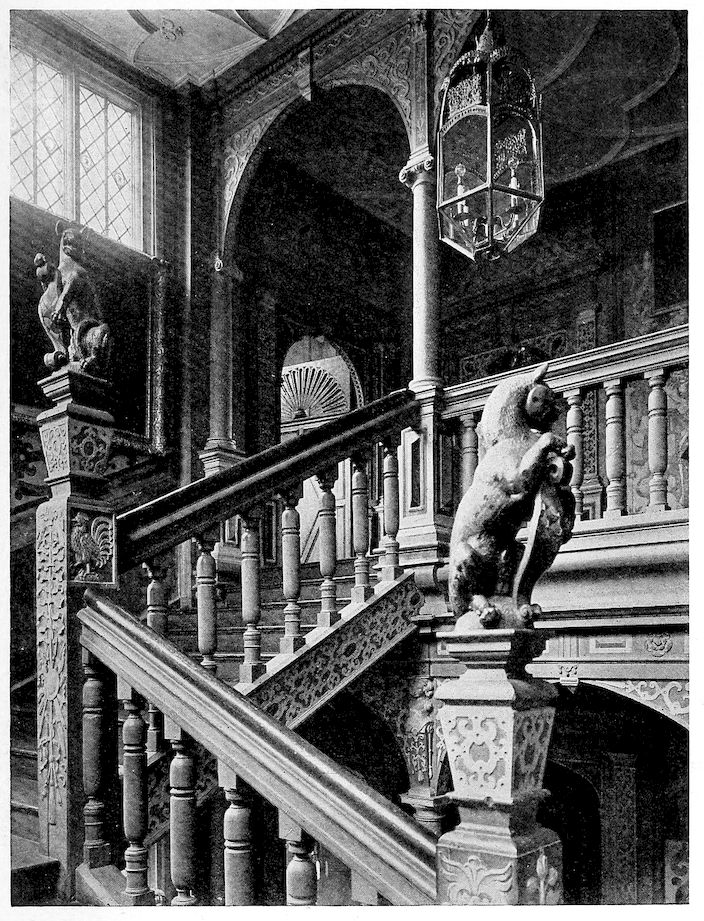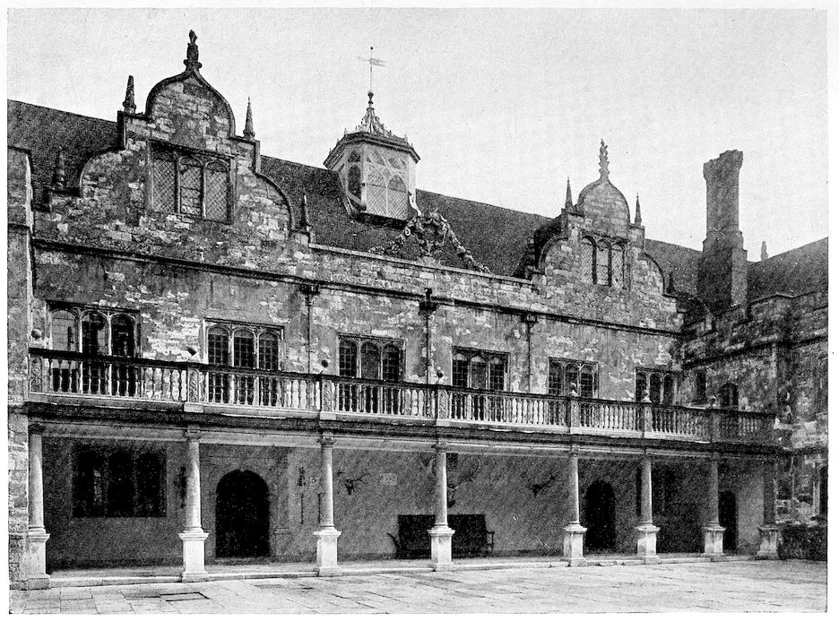 A stone lobby under the oriel window divides the Green Court from the Stone Court. In summer the great oak doors of this second gate-house are left open, and it has sometimes happened that I have found a stag in the banqueting hall, puzzled but still dignified, strayed in from the park since no barrier checked him.