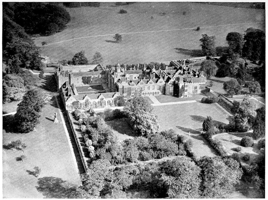 There are two sides from which you may first profitably look at the house. One is from the park, the north side. From here the pile shows best the vastness of its size; it looks like a mediaeval village. It is heaped with no attempt at symmetry; it is sombre and frowning; the grey towers rise; the battlements cut out their square regularity against the sky; the buttresses of the old twelfth-century tithe-barn give a rough impression of fortifications. There is a line of trees in one of the inner courtyards, and their green heads show above the roofs of the old breweries; but although they are actually trees of a considerable size they are dwarfed and unnoticeable against the mass of the buildings blocked behind them. The whole pile soars to a peak which is the clocktower with its pointed roof: it might be the spire of the church on the summit of the hill crowning the mediaeval village. At sunset I have seen the silhouette of the great building stand dead black on a red sky; on moonlight nights it stands black and silent, with glinting windows, like an enchanted castle. On misty autumn nights I have seen it emerging partially from the trails of vapour, and heard the lonely roar of the red deer roaming under the walls.