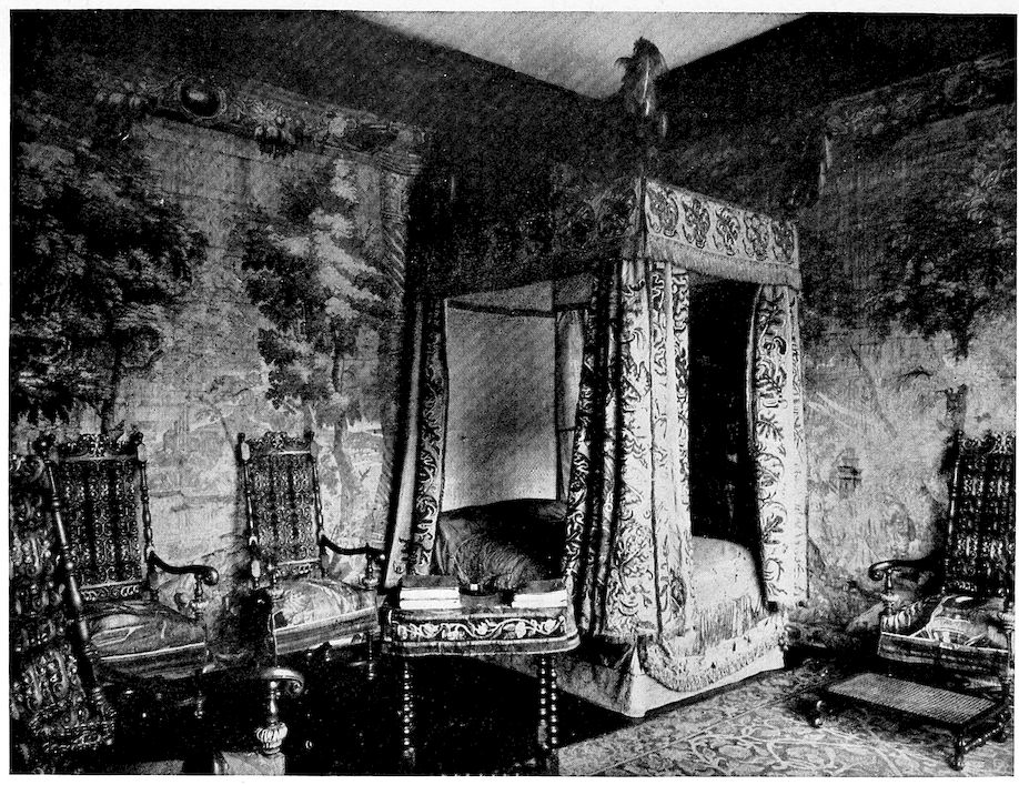 It is almost a relief to go from here to the Venetian Ambassador’s Bedroom. Green and gold; Burgundian 16tapestry, mediaeval figures walking in a garden; a rosy Persian rug—of all rooms I never saw a room that so had over it a bloom like the bloom on a bowl of grapes and figs. I cannot keep the simile, which may convey nothing to those who have not seen the room, out of my mind. Greens and pinks originally bright, now dusted and tarnished over. It is a very grave, stately room, rather melancholy in spite of its stateliness. It seems to miss its inhabitants more than do any of the other rooms. Perhaps this is because the bed appears to be designed for three: it is of enormous breadth, and there are three pillows in a row. Presumably this is what the Italians call a letto matrimoniale.