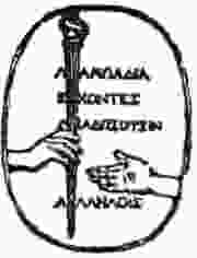 Stanching Blood: Blood spurting in bright-red jets means a severed artery—and great danger. A steady, dark-red stream means a cut vein. For either, knot two handkerchiefs hard together, trace the course of 23the blood vessel, put the biggest knot over it, thrust in a stick, and twist until the knot presses deep into the flesh. In case of an artery, put the knot between the hurt and the trunk. For a vein set it between the wound and the extremities. Work fast—a minute may mean life or death.