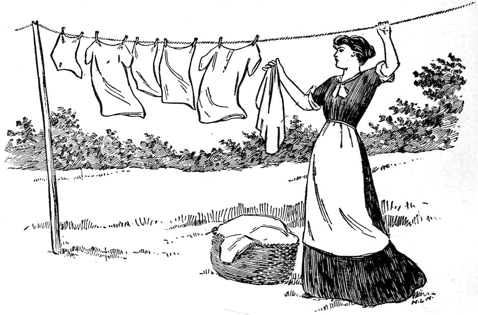 The laundry work of the family ought to be done at home, and the clothes should be 60hung upon lines to dry. In other countries clothes are boiled after first being washed with soap, but this is not possible here; probably it never will be possible. Yet clothes can be washed with soap and water and then leached,—that is, rinsed in lye water. Wood ashes are easy to get, and lye water—that is, water in which the ashes have been soaked—will destroy all germs. The clothes rinsed in it are as safe as those which have been boiled.