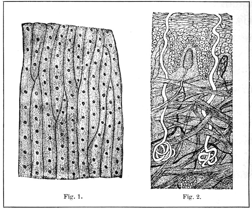 Besides the outer garments in which we clothe it, the body has a garment of its own. This garment is never laid aside; and though it is in constant use, it never wears out. We call it the skin. The skin is meant to protect the body. Lying close under it are many nerve ends, delicate blood vessels, oil glands, sweat glands, and other tiny organs that are too small to be seen without a microscope, but which are needed to keep the 66body in good order. In the pictures which are shown on this page, you will see how these tiny organs look when they are many times magnified.