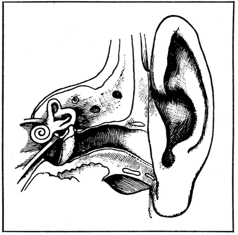Strange as it may seem, the ears are even more delicate than the eyes, and more readily injured; and when hurt, there is less that science can do for them. The outer ear only catches sound and turns it inward. The parts of the ear that really hear are deep in 77the head, where they can be well protected. The little canal leading into the ear secretes wax, which hinders insects from crawling in. Sometimes they do get in, despite the wax. In some parts of this country, there are leeches that get into the ear. When they do this they cause great pain and often produce deafness. We should never try to pick or lift anything of this sort out of the ear. The best way, when anything alive gets into the ear, is to pour in a little quantity of oil. This nearly always causes the creature which has gotten in to back out, in order to escape the oil. If, instead of coming out, it is drowned, it must be removed by some skillful physician.