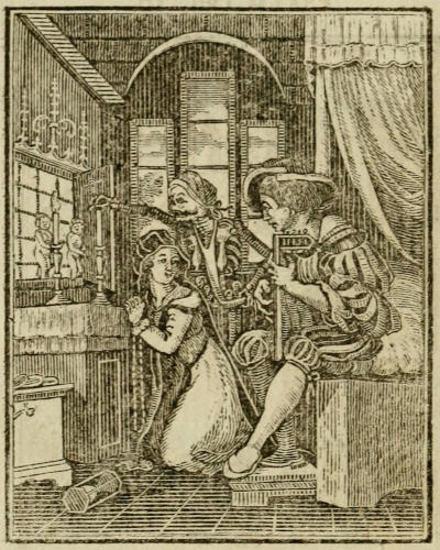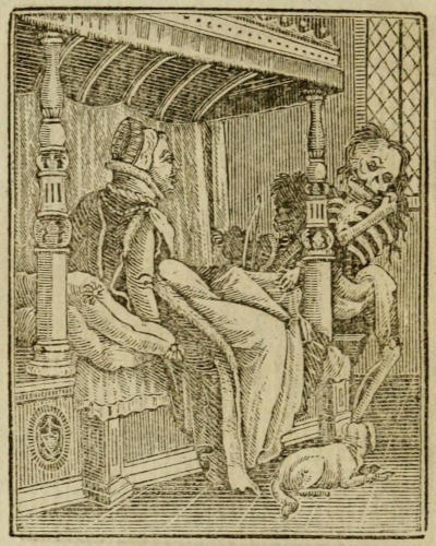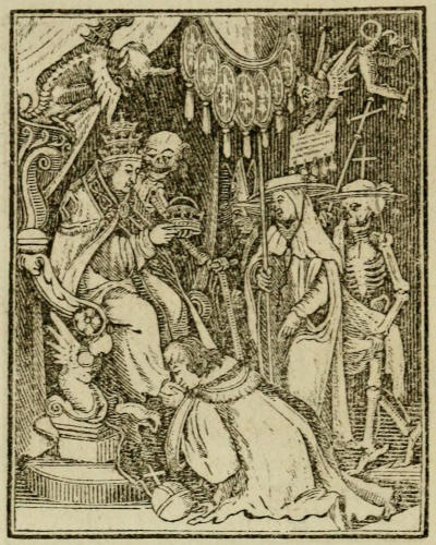 It would be an endless Task, and afford but little Entertainment to the Reader, to reckon up here a long List of Books in which the Subject has been reiterated: We shall therefore content ourselves with mentioning that it appeared in the Chronicle of Hartmannus Schedelius, printed at Nuremberg in 1493, Folio[13], usually called the Nuremberg Chronicle; in the Quotidian Offices of the Church, printed at Paris, 1515, in 8vo[14]; in several Horæ, Missals, &c. and even so late as in A Book of Christian Prayers, collected out of the ancient Writers and best learned of our Time, first printed in 4to. 1569, and afterwards in the same Size in 1608; and that, in Addition to all these and others which might be mentioned, the Painting at Basil was the Cause of the Publication of the Imagines Mortis, from which the present is copied and translated, and of which therefore it will be necessary here to give an Account; first observing, that the Excellence of the Cuts in the Original, which are here also copied with sufficient Fidelity, has induced an Opinion that they were the Work of Holbein, a Fact which we mean hereafter to inquire into.