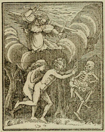 In 1547, another Edition was published of this Book, in French; it was entitled, “Les Images de la Mort,” and printed at Lyons, A l’Escu de Cologne, Chez Jehan Frellon; the Title-Page also informs us that twelve Cuts are added to it, and on Examination we find that the Cuts inserted in Page 40, and the seven subsequent Pages of this Work, and four Cuts of Boys, which, as not relating to this Subject, are in the present Edition omitted (none of which occur[xviii] in either the French Edition of 1538, or the Latin one of 1542, the only two prior Editions that I know of) are to be found in this of 1547[15].