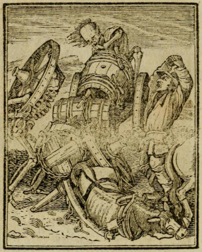 Having thus accounted for the Existence of the Book, and for its Arrival in France, it remains to speak of the several Impressions which it there underwent. We have already mentioned one, the earliest which we know of, printed in small Quarto, at Lyons, soulz l’Escu de Cologne, by Melchior and Gaspar Trechsel, in 1538: The Cuts in this Edition are forty-three in Number, and no more; and over each is, in Latin, a Passage from either the Old or New Testament or Apocrypha, which, in the present Publication, is given in English, from the Translation of the Bible now in use. Under the Cuts are four Lines in French Verse, the Substance of which has been preserved in all the Editions, whether they were in Latin, French, or Italian. This Edition, in order to make it of a tolerable Size (for the Cuts alone would have been too few to constitute a Volume) is accompanied[xvi] with several Tracts in French, which, as not relating to, or connected with, our present Subject, we here forbear to enumerate; but it is necessary, before we close our Account of this Edition of 1538, to remark, that it is preceded by a Dedication in French, to the very Reverend Abbess of the Religious Convent of St. Peter of Lyons, Madam Jehanne de Touszele; and in this Dedication the Author of it notices, that the Name and Surname (or, as we term them, the Christian and Surname) of the Abbess and himself are precisely the same in sound, excepting only the Letter T, from which I conjecture (for his Name does not any where appear) that his Name was Jean, or, as it was anciently written, Jehan [i. e. John] de Ouszell, or Ozell, as it is now usually spelt. In this Dedication is also a Passage, a Translation of which will be given hereafter, from which it appears that the Person by whom the Cuts were designed, was then dead, leaving behind him several others of the same Kind, which, though drawn, were unfinished, and particularly one representing a Waggoner crushed under his overthrown Waggon; in which Cut, a Figure of Death is represented secretly sucking through a Reed, the Wine out of a Cask; and that to these unfinished Cuts no one had dared to put the last Hand.