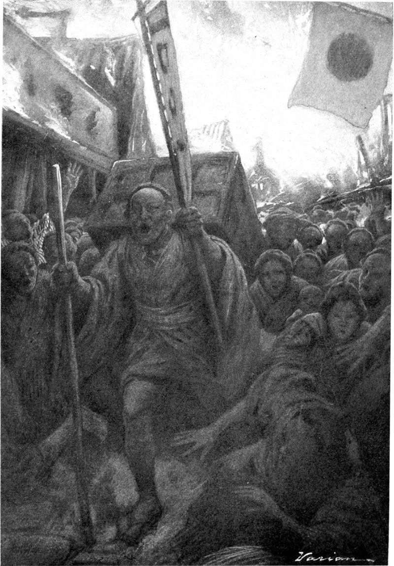 The coolies distributed this bento among the men and women who were in distress. Every man and woman, therefore, 140whether young or old, who was sore oppressed by hunger, was glad to get hold of this food and was relieved by it, though it was only for a time. With admirable sagacity Chobei quickly hired many more coolies and prepared more luncheons, sending them to every quarter of the city; and so wherever men went they saw the selfsame flag flying for charity, and the whole city was surprised, and praised the generosity of this Kinokuniya Bunzayemon.