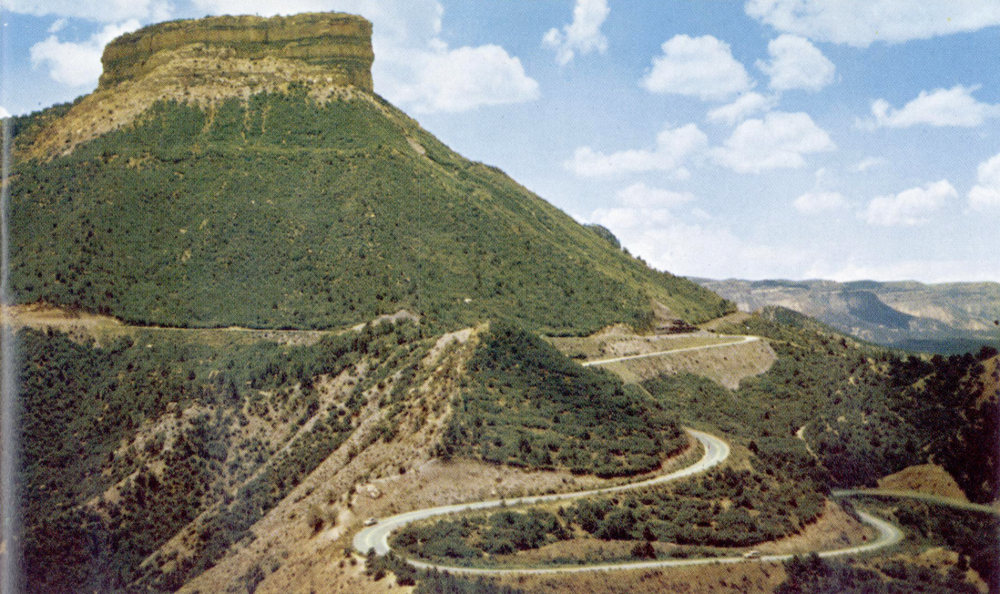 MESA VERDE—the “green tableland” rises 1,500 feet above the Mancos Valley, here seen in its colorful October foliage. In the foreground, Highway 160 bears westward to the pioneer town of Mancos, 1 mile distant, and to the Park Entrance, 8 miles farther, just below the distant bulk of Ute Mountain. Beneath the bold promontory of Point Lookout the Park Entrance Highway can be seen climbing to the top of Mesa Verde.