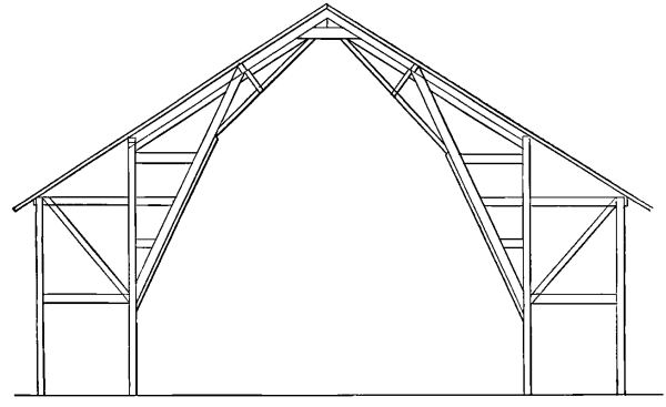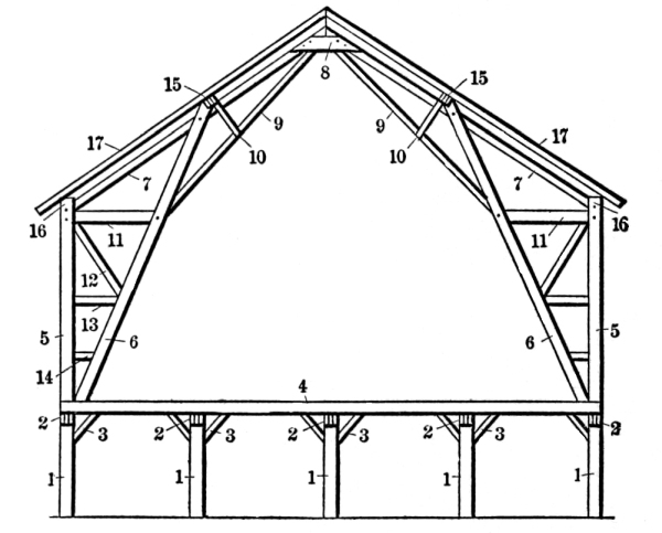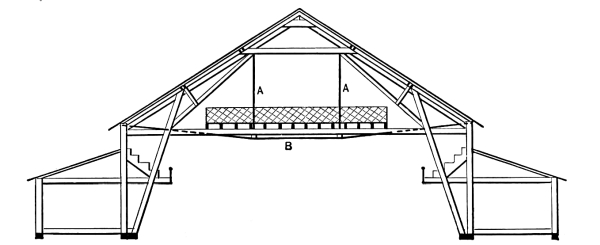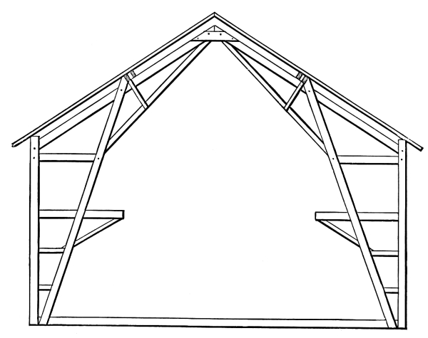 7. The full benefit of the self supporting arch roof, a construction of combined triangles, long braces and perpendicular timbers.