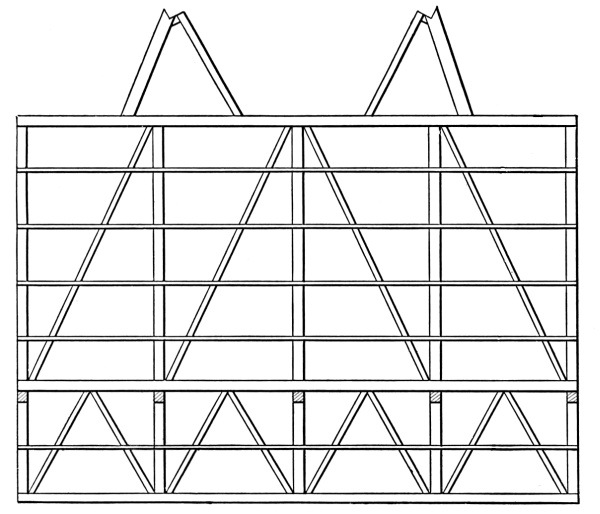 First Test of Strength.—A small model made of linden strips 3-16 inch thick and ½, ⅜ and ¼ in inch width, made on a scale of ½ to 12 and representing a barn 40 × 60, with 8-foot basement and 20-foot superstructure, was found strong enough to support four men of average weight. [Pg 16]